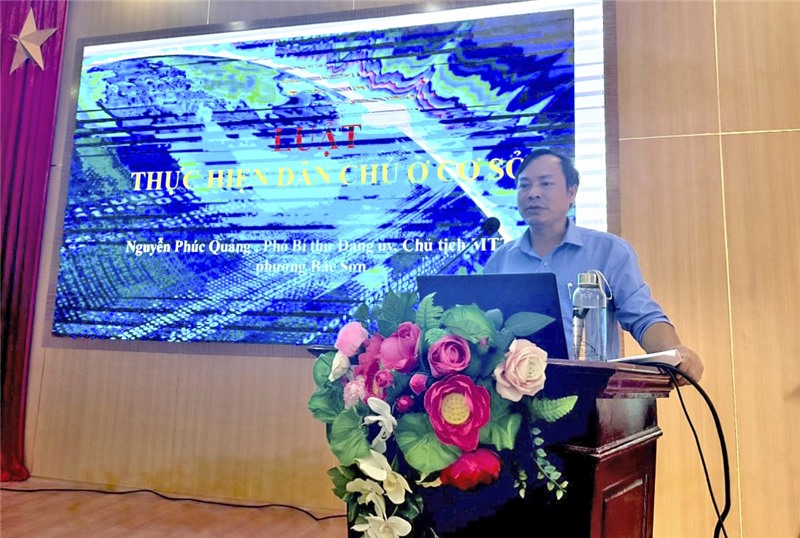 Tiếp đó, đồng chí Nguyễn Phúc Quảng, Phó Bí thư Đảng bộ, Chủ tịch Ủy ban MTTQ phường đã phổ biến về Luật thực hiện Dân chủ ở cơ sở. Ngày 10/11/2022, Quốc hội khóa XV đã ban hành Luật thực hiện dân chủ ở cơ sở - Luật số 10/2022/QH15, có hiệu lực kể từ ngày 01/7/2023, gồm 6 Chương, 91 Điều. Trong quá trình tuyên truyền, lãnh đạo phường Bắc Sơn nhấn mạnh vào những nội dung, chính sách mới đáng lưu ý về nguyên tắc và phạm vi thực hiện dân chủ ở cơ sở; phân tích các quy định về phát huy quyền làm chủ của Nhân dân trong thực hiện quy chế dân chủ như những nội dung chính quyền phải công khai cho dân biết; các nội dung, hình thức dân bàn, dân quyết định, dân kiểm tra, giám sát; hoạt động của Ban Thanh tra nhân dân, Ban giám sát đầu tư cộng đồng; quyền thụ hưởng của công dân về thành quả phát triển KT-XH và nghĩa vụ kịp thời phản ánh, kiến nghị, báo cáo cơ quan có thẩm quyền khi phát hiện hành vi vi phạm pháp luật về thực hiện dân chủ ở cơ sở.
