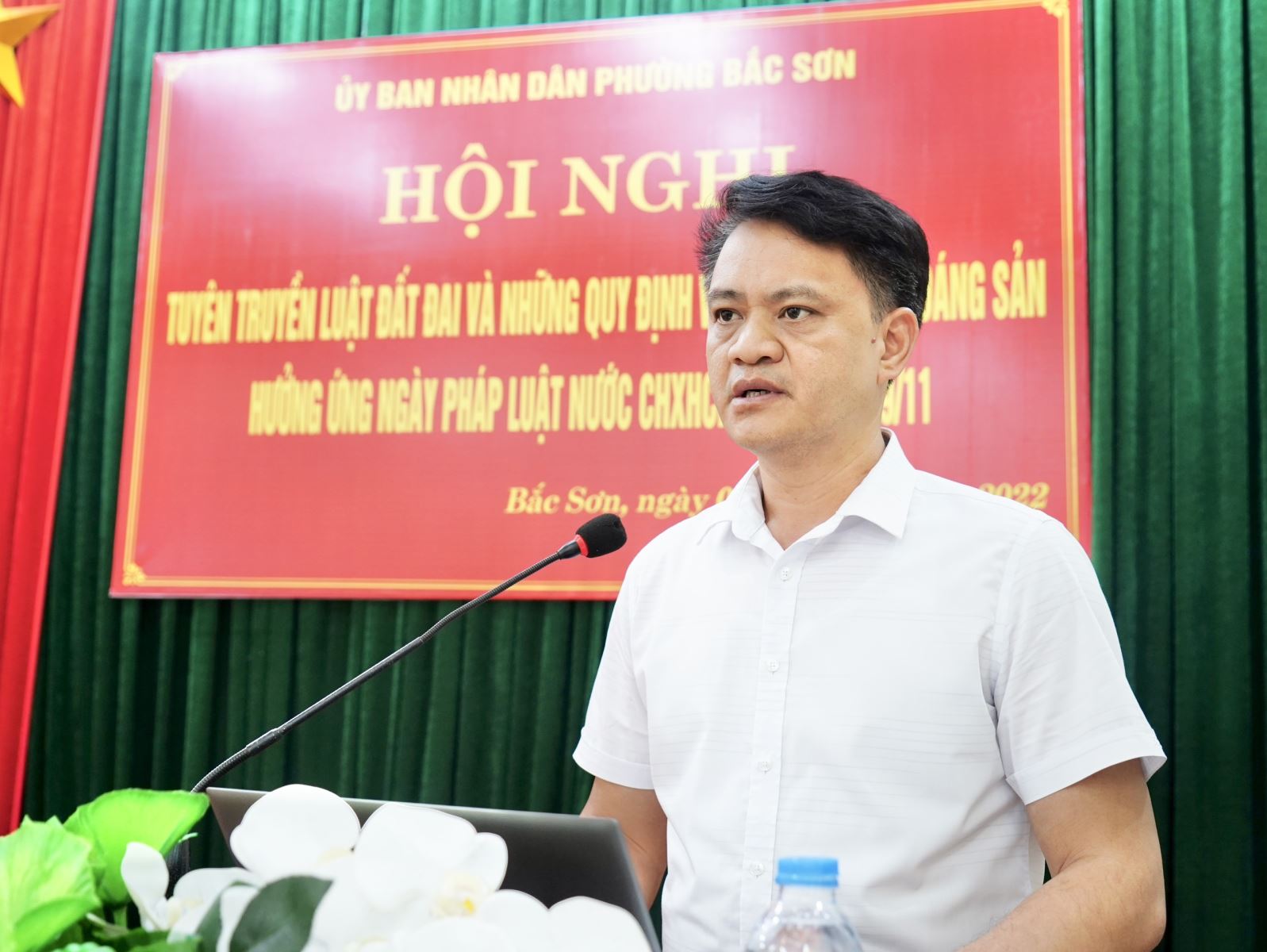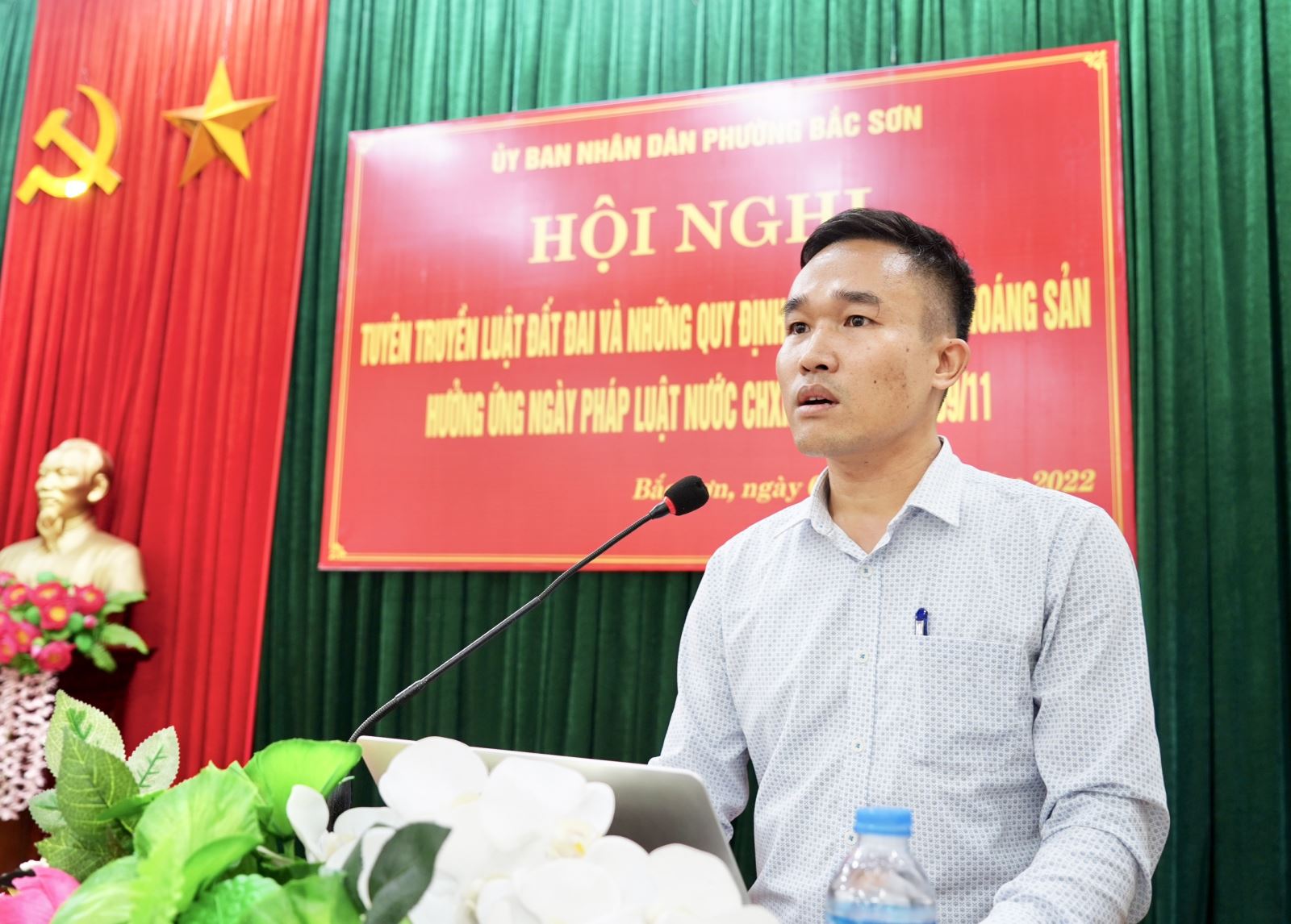 Hưởng ứng Ngày pháp luật nước Cộng hoà Xã hội chủ nghĩa Việt Nam, chiều 1/11, Phường Bắc Sơn tổ chức hội nghị tuyên truyền, phổ biến Luật đất đai 2013 và các quy định của pháp luật về tài nguyên khoáng sản.