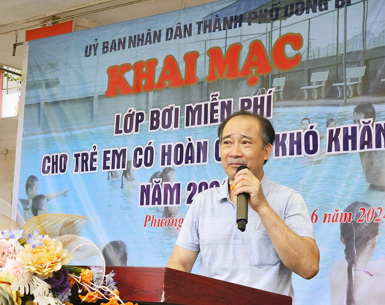 Đồng chí PCT UBND phường Phương Đông phát biểu khai mạc lớp bơi.