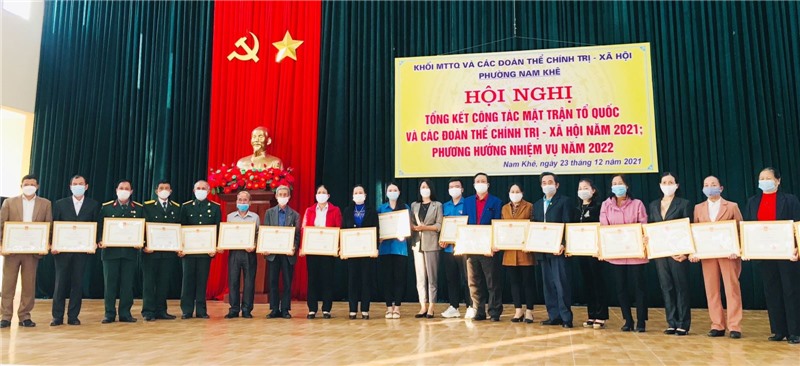 Tại hội nghị, phường Nam Khê đã khen thưởng 25 tập thể, 27 cá nhân và biểu dương 10 tập thể, 26 cá nhân có thành tích xuất sắc trong công tác Khối MTTQ và các đoàn thể chính trị - xã hội, các tổ chức xã hội nghề nghiệp phường năm 2021.