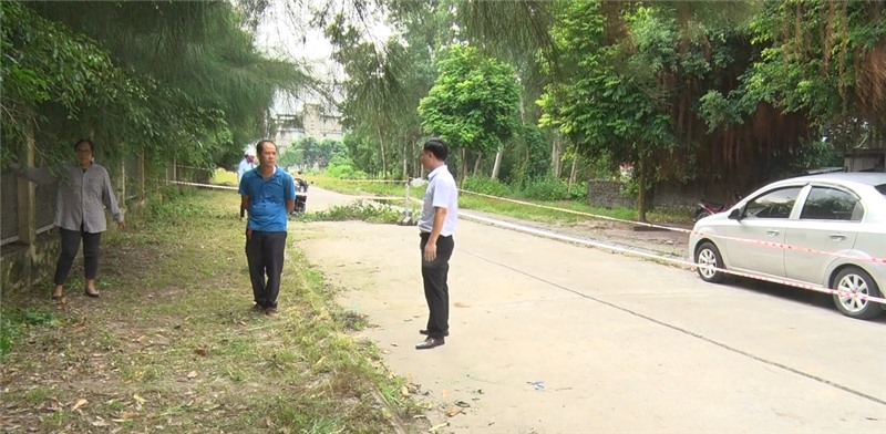Lãnh đạo phường Nam Khê chỉ đạo chăng dây cảnh báo giao thông tại hiện trường.