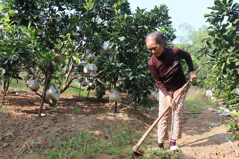 Xới gốc làm cỏ là công việc thường xuyên được bà Mạn thực hiện để chăm sóc vườn bưởi Diễn.