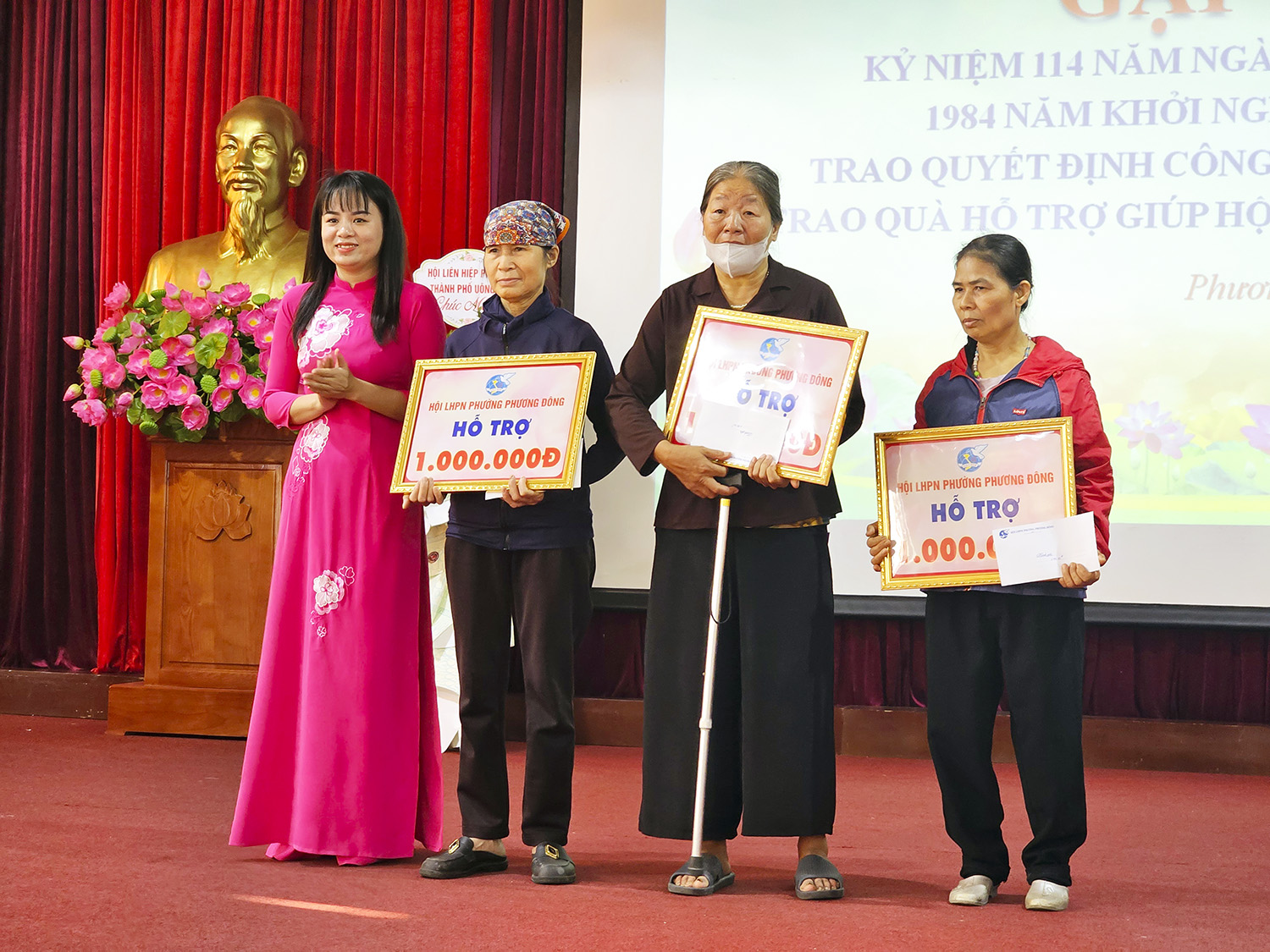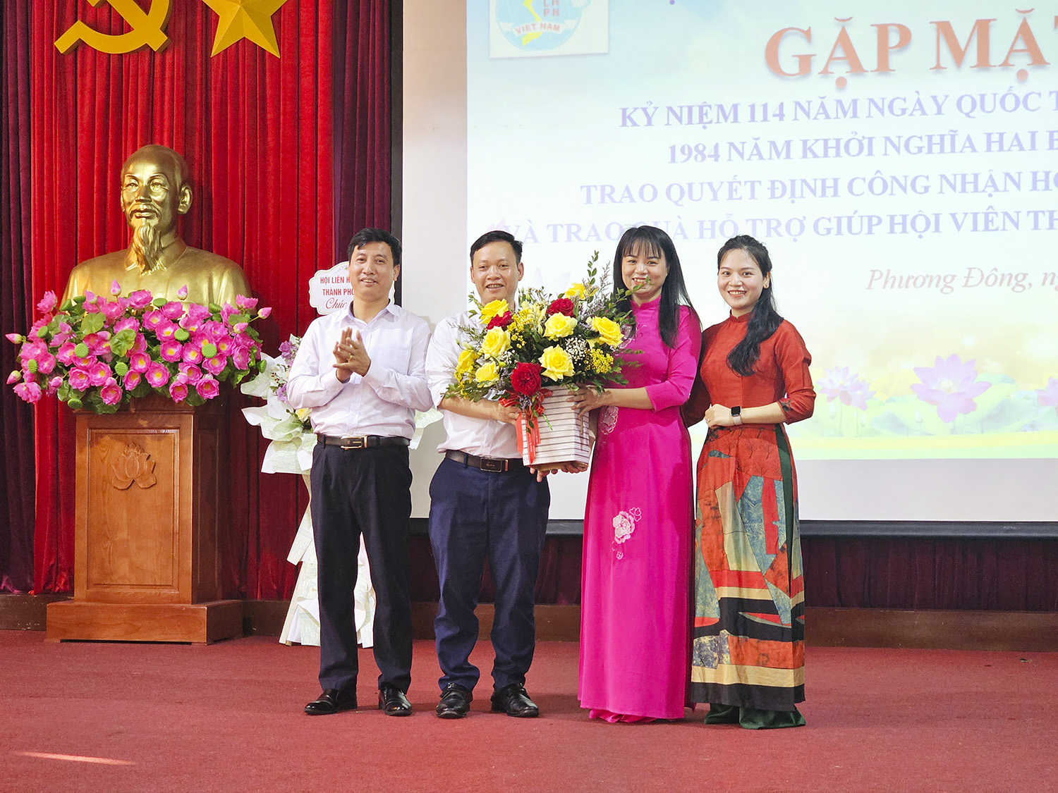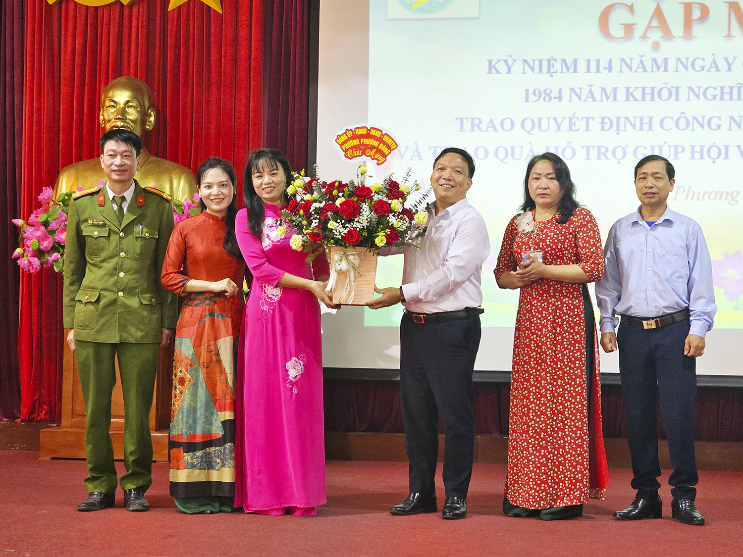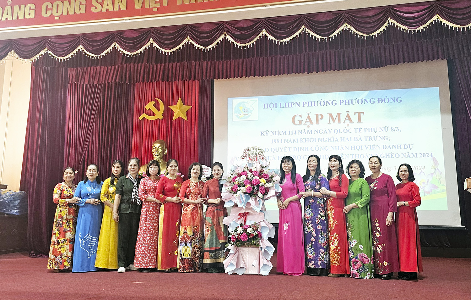 Lãnh đạo cấp trên và các chi hội khu dân cư tặng hoa chúc mừng tại buổi gặp mặt.