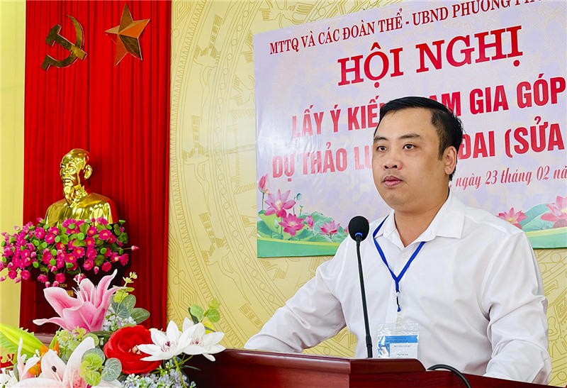 Tại hội nghị, lãnh đạo UB MTTQ phường đã thông tin về một số điểm mới trong nội dung Luật đất đai (sửa đổi). Dự thảo Luật Đất đai (sửa đổi) gồm 16 chương, 245 điều, trong đó giữ nguyên 28 điều; sửa đổi, bổ sung 184 điều; bổ sung mới 41 điều và bãi bỏ 8 điều.