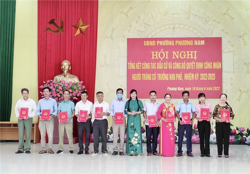 Tại hội nghị, phường Phương Nam đã công bố và trao quyết định công nhận người trúng cử trưởng khu phố nhiệm kỳ 2022 - 2025 cho 14 người trúng cử. UBND phường khen thưởng các tập thể và cá nhân đã có thành tích xuất sắc trong tổ chức bầu cử trưởng khu phố nhiệm kỳ 2022 - 2025.
