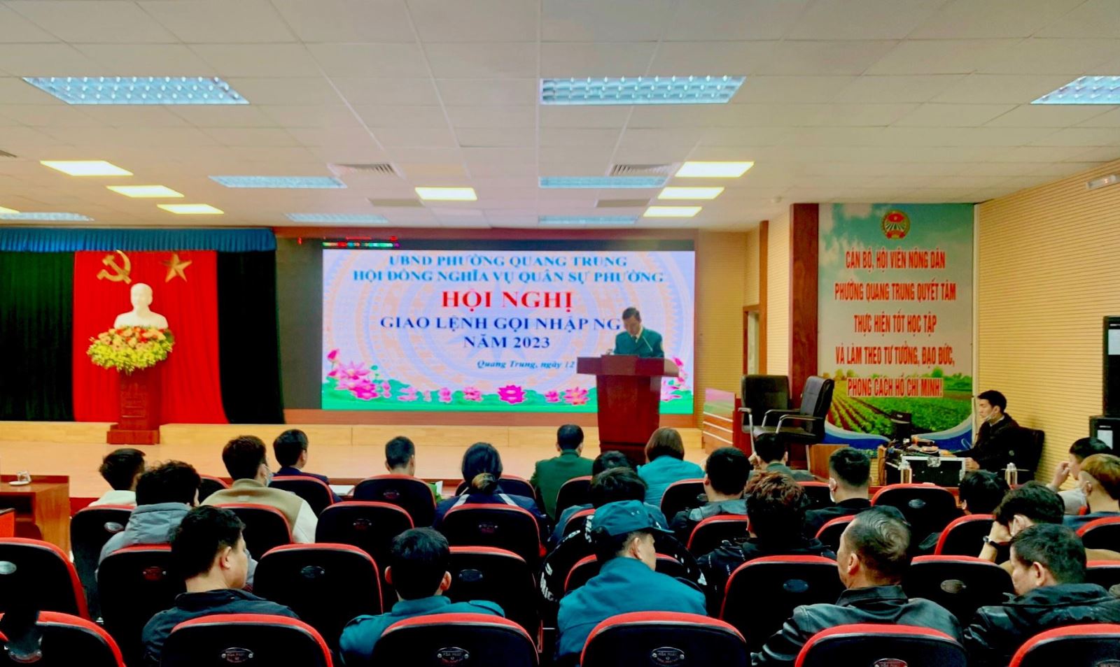 Ngày 05/01/2023, Hội đồng nghĩa vụ Quân sự phường Quang Trung đã tổ chức Hội nghị phát lệnh gọi công dân lên đường nhập ngũ năm 2023. Dự Hội nghị có các đồng chí lãnh đạo Đảng uỷ, HĐND, UBND phường, các đồng chí thành viên Hội đồng nghĩa vụ quân sự phường, cán bộ công chức, Bí thư chi bộ, trưởng khu dân cư cùng 15 thanh niên trúng tuyển nghĩa vụ quân sự và Công an nhân dân năm 2023.
