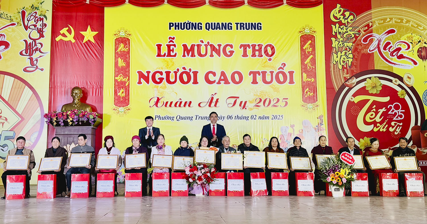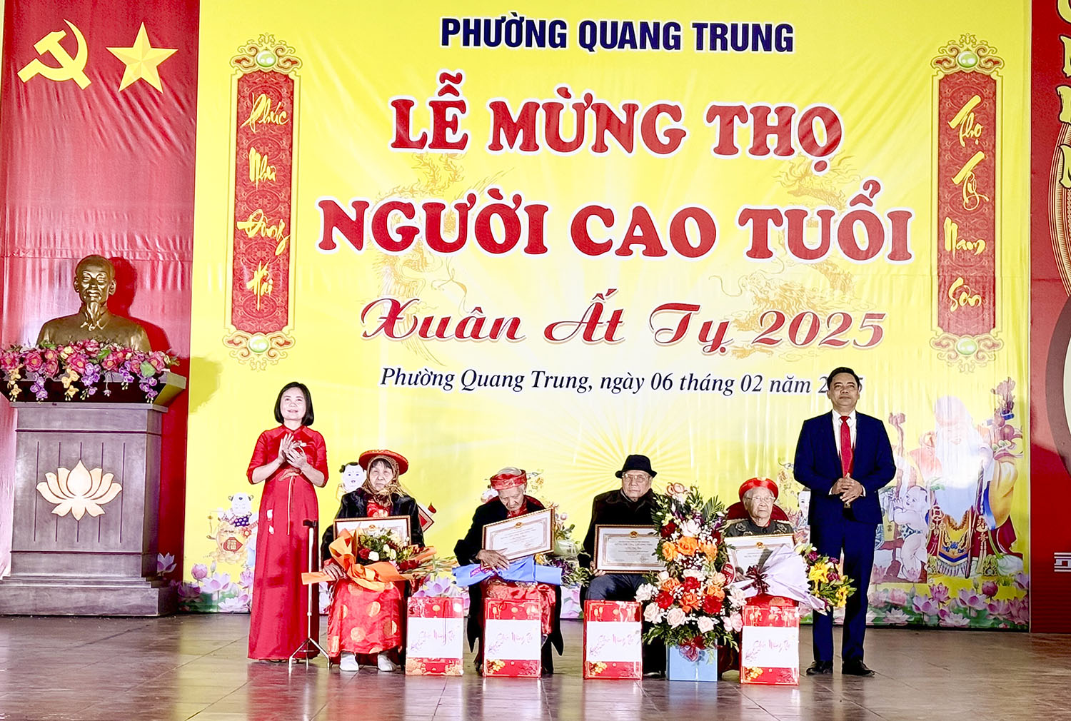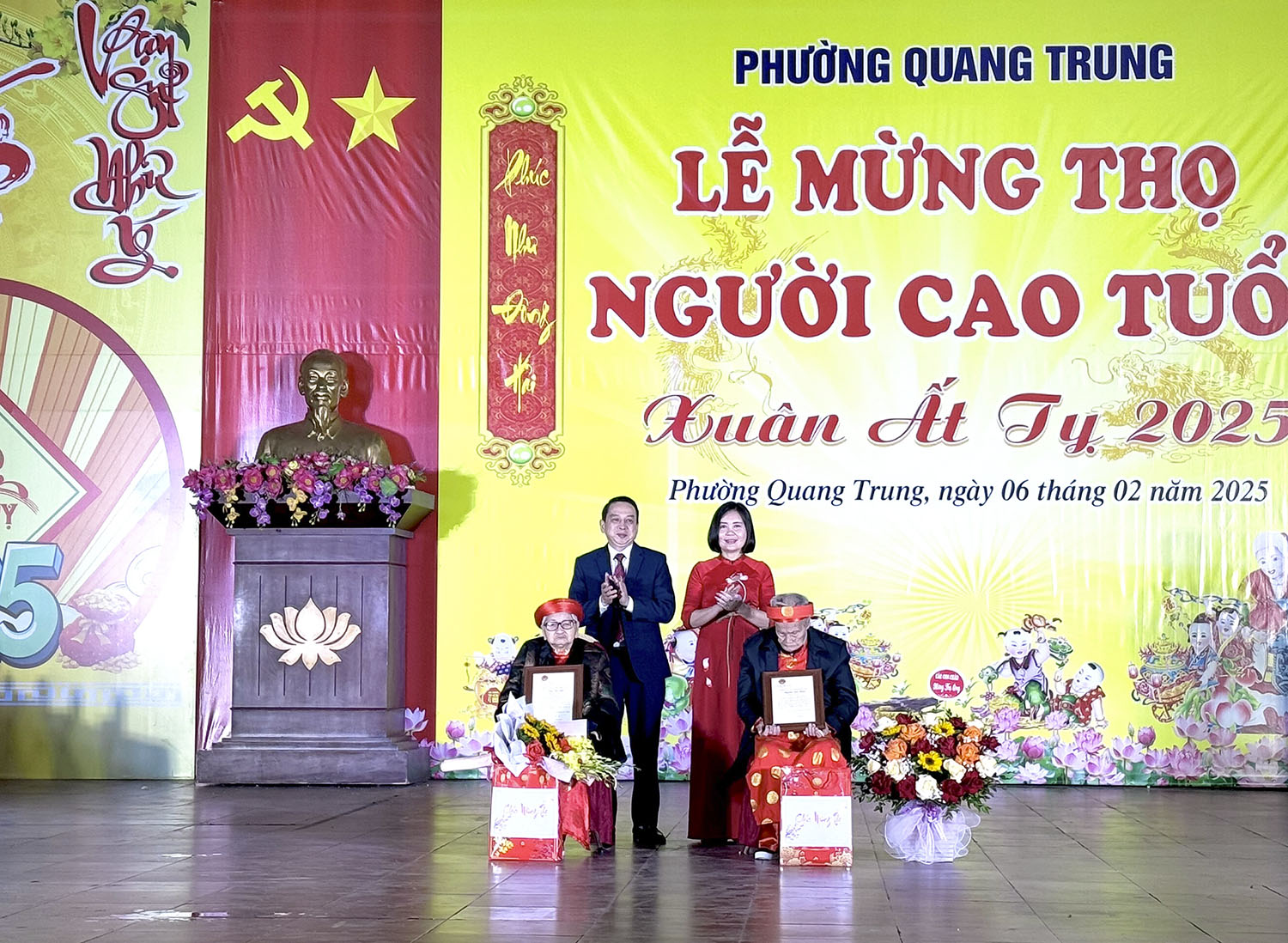 Trong chương trình, phường Quang Trung đã tổ chức mừng thọ cho 560 cụ cao niên, trong đó có 6 cụ trên 100 tuổi, 2 cụ tròn 100 tuổi, 8 cụ 95 tuổi, 17 cụ 90 tuổi, 72 cụ 85 tuổi, 75 cụ 80 tuổi, 183 cụ 75 tuổi và 197 cụ 70 tuổi.