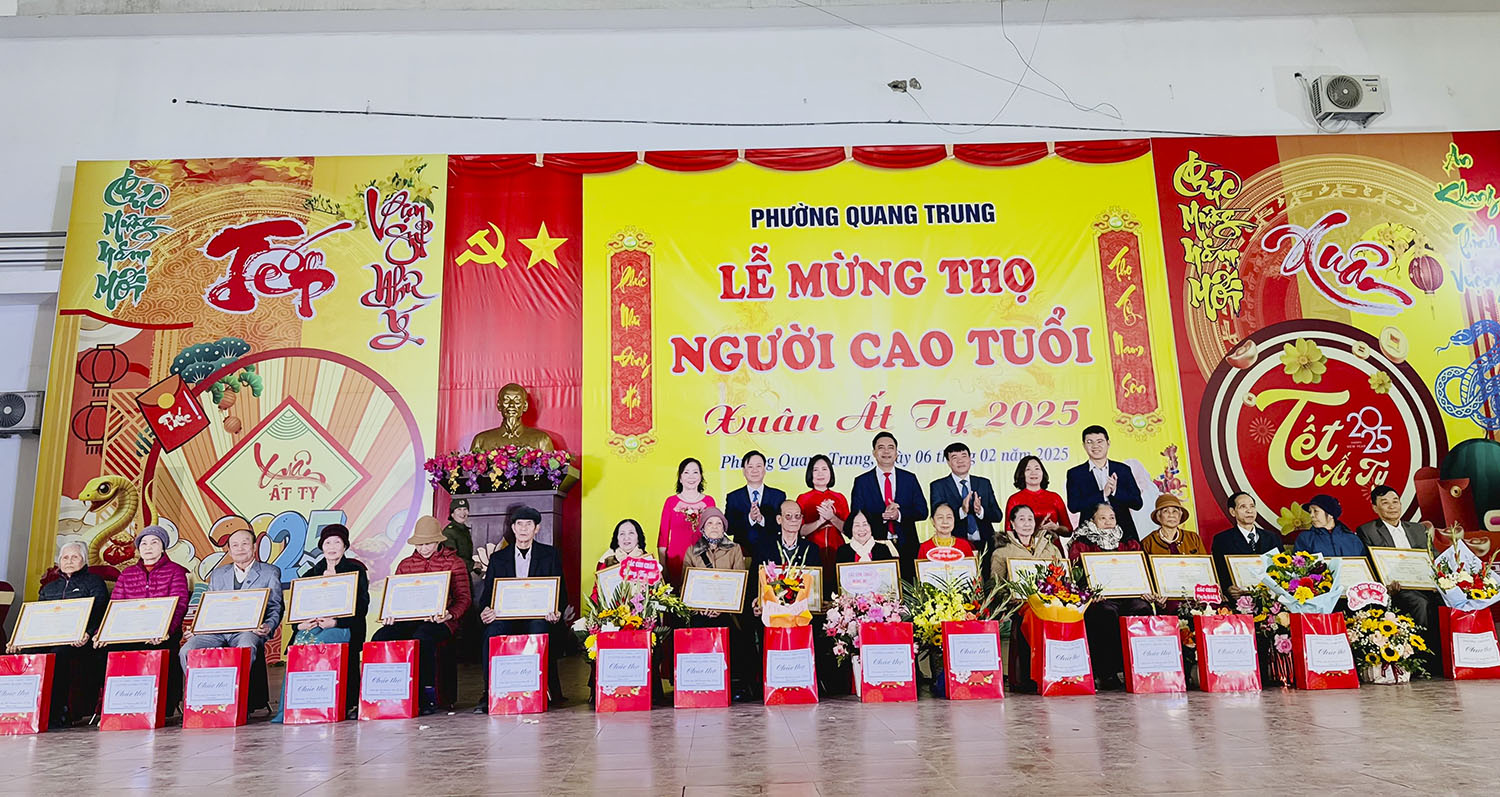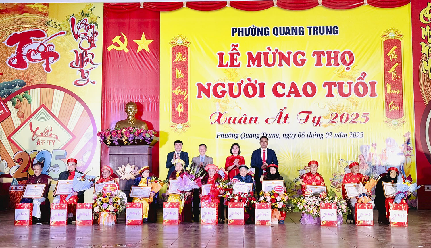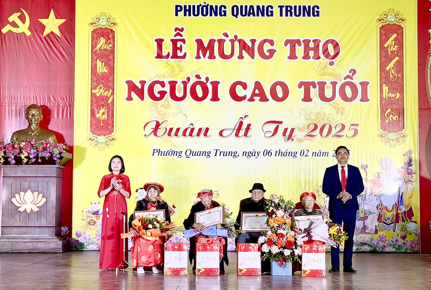 Trong chương trình, phường Quang Trung đã tổ chức mừng thọ cho 560 cụ cao niên, trong đó có 6 cụ trên 100 tuổi, 2 cụ tròn 100 tuổi, 8 cụ 95 tuổi, 17 cụ 90 tuổi, 72 cụ 85 tuổi, 75 cụ 80 tuổi, 183 cụ 75 tuổi và 197 cụ 70 tuổi.