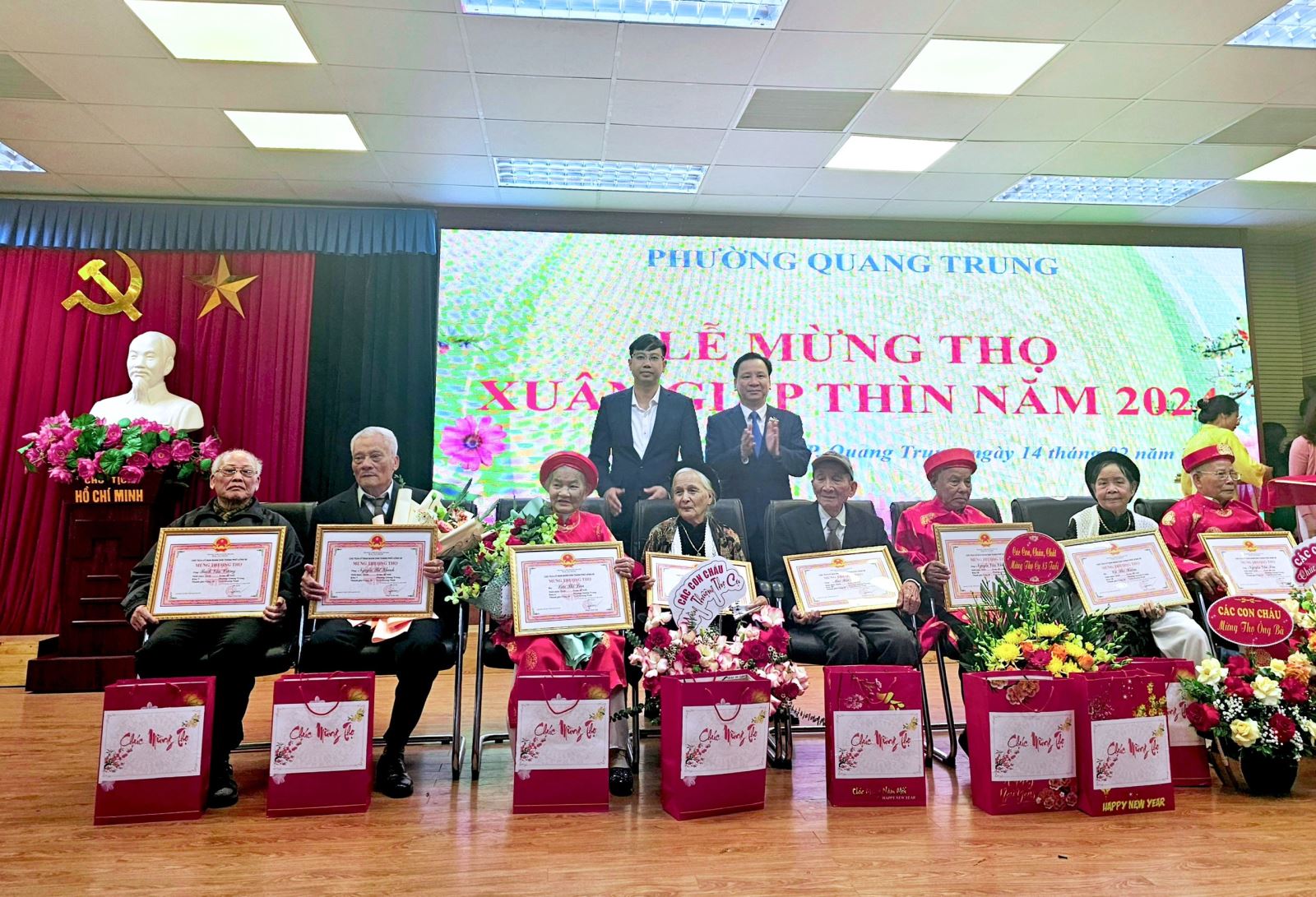 Tặng quà, chúc mừng các cụ được mừng thọ đầu xuân, lãnh đạo thành phố, phường Quang Trung chúc các cụ thật nhiều sức khỏe, sống trường thọ, sum vầy cùng con cháu. Nhấn mạnh vai trò của người cao tuổi trong sự nghiệp xây dựng và phát triển kinh tế - xã hội địa phương, các đồng chí mong muốn các cụ tiếp tục nêu gương sáng động viên con cháu chấp hành tốt các chủ trương, đường lối của Đảng, chính sách pháp luật của Nhà nước, thi đua lao động sản xuất, xây dựng thành phố ngày càng phát triển.