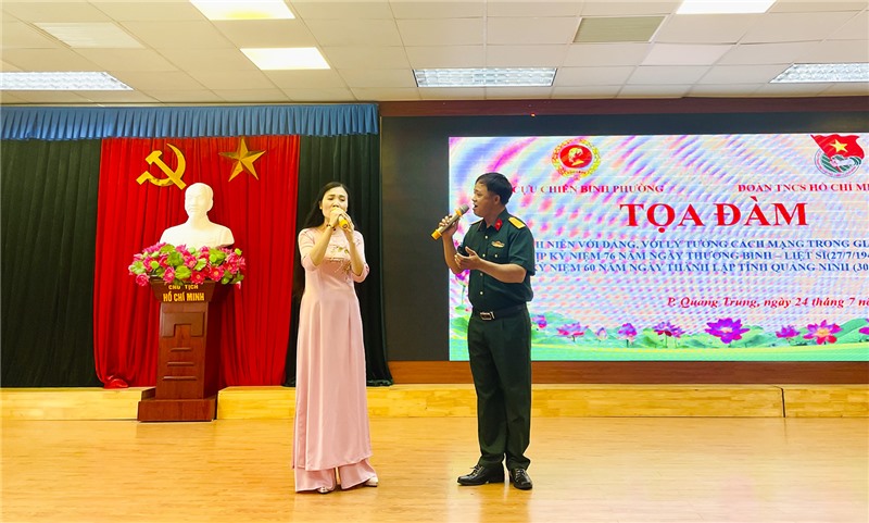 Nhân kỷ niệm 76 năm ngày Thương binh - Liệt sĩ 27/7 (1947-2023), hướng đến kỷ niệm 60 năm Ngày thành lập tỉnh Quảng Ninh 30/10 (1963 - 2023), sáng 24/7, Hội Cựu chiến binh và Đoàn Thanh niên phường Quang Trung phối hợp tổ chức Chương trình toạ đàm với chủ đề “Thanh niên với Đảng, với lý tưởng cách mạng trong giai đoạn hiện nay”. Dự chương trình có các đồng chí: Nguyễn Văn Hạnh - Phó Chủ tịch Hội Cựu chiến binh thành phố; Trần Văn Giàu - Bí thư Thành đoàn; lãnh đạo Đảng ủy - HĐND - UBND - MTTQ và các đoàn thể CT-XH phường; trên 200 đại biểu là hội viên Hội Cựu chiến binh, đoàn viên thanh niên phường Quang Trung.