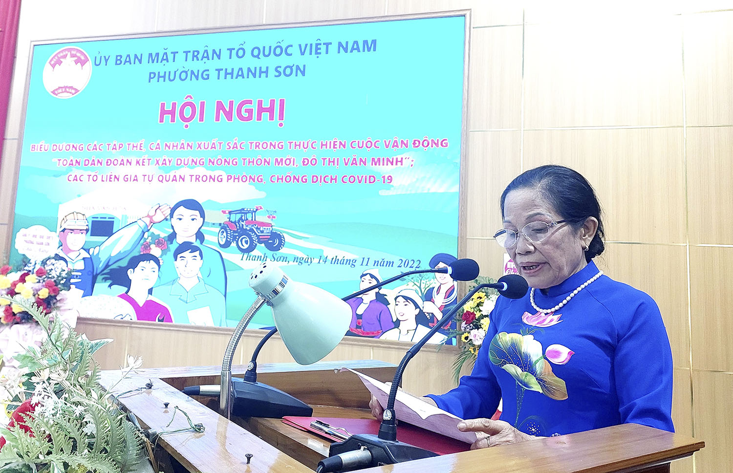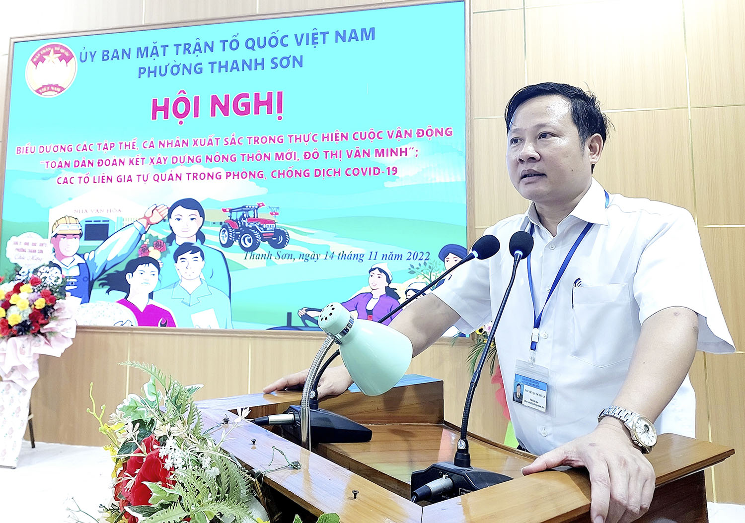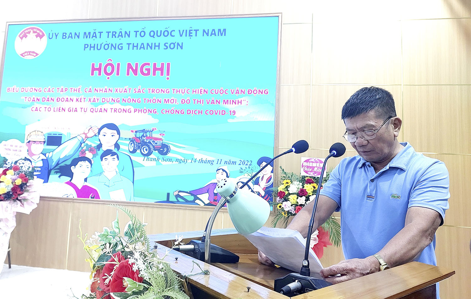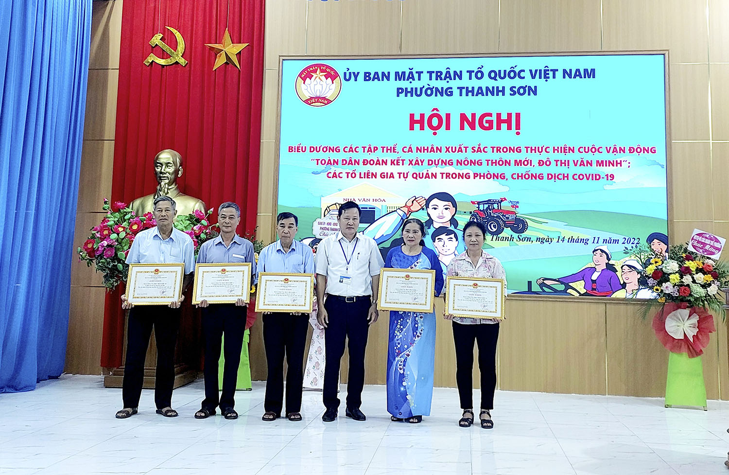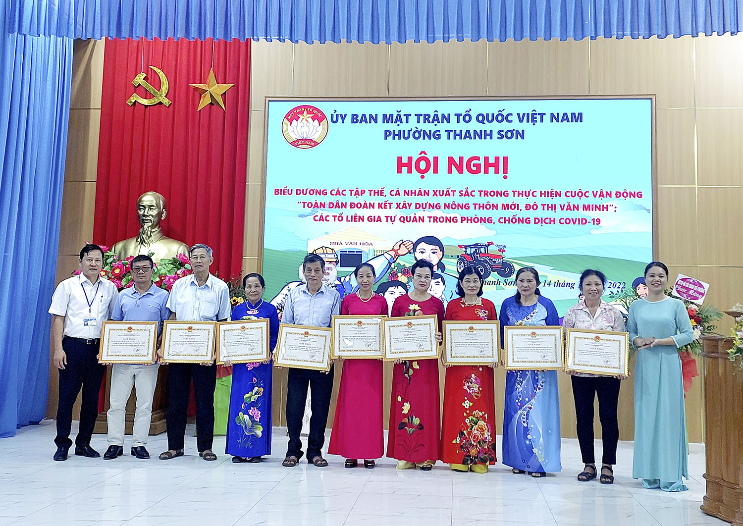 Tại hội nghị, phường Thanh Sơn đã biểu dương, khen thưởng 5 tập thể và 5 cá nhân có thành tích xuất sắc trong thực hiện Cuộc vận động “Toàn dân đoàn kết xây dựng nông thôn mới, đô thị văn minh”; khen thưởng 10 Tổ liên gia tự quản phòng, chống dịch Covid-19.