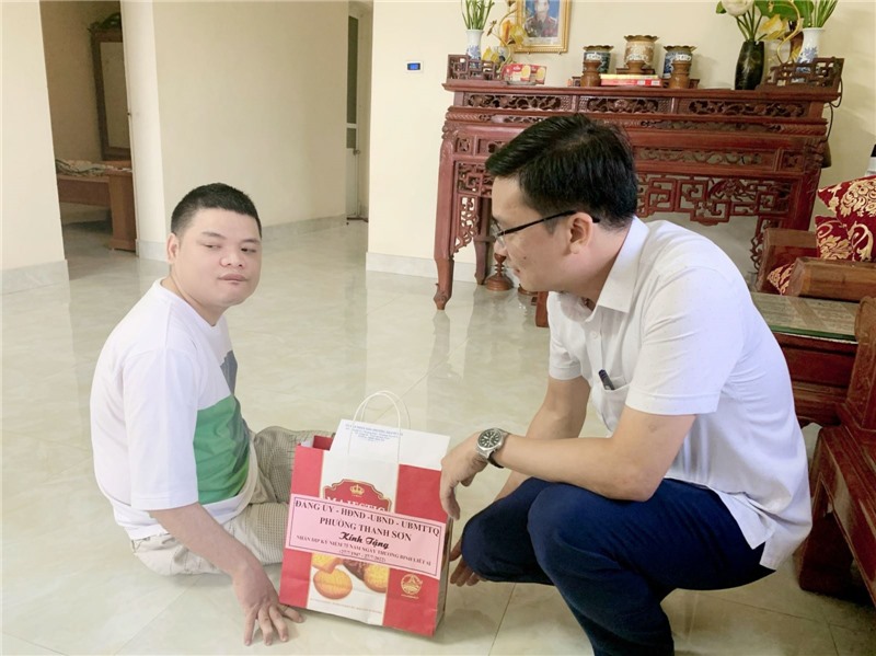 Đồng chí Bùi Tiến Hưng, Bí thư Đảng ủy, Chủ tịch UBND phường thăm, tặng quà anh Vũ Thành Trung, con đẻ người hoạt động kháng chiến bị nhiễm chất độc hoá học.