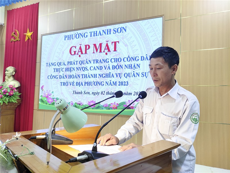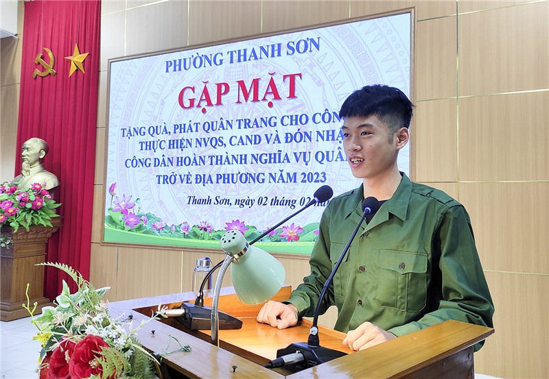 Phát biểu tại buổi gặp mặt, lãnh đạo phường Thanh Sơn biểu dương tinh thần trách nhiệm, ý thức công dân của các thanh niên chuẩn bị lên đường nhập ngũ. Đồng thời mong muốn trong môi trường quân ngũ, các thanh niên ưu tú của phường Thanh Sơn sẽ tiếp tục phát huy truyền thống anh hùng của quê hương, không ngừng nỗ lực phấn đấu, rèn luyện bản lĩnh tác phong, tư cách, trình độ, vượt qua mọi khó khăn, hoàn thành xuất sắc mọi nhiệm vụ được giao.