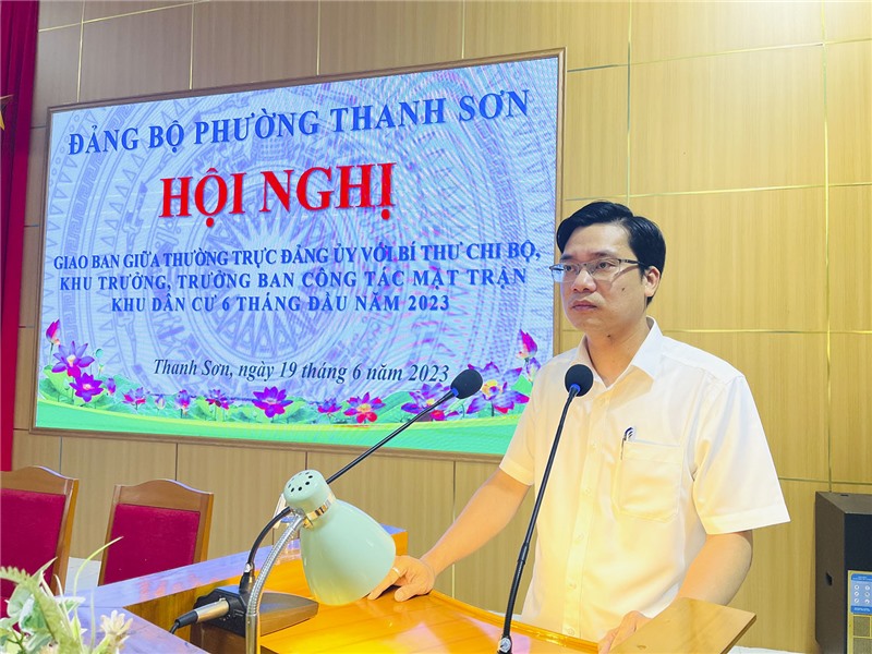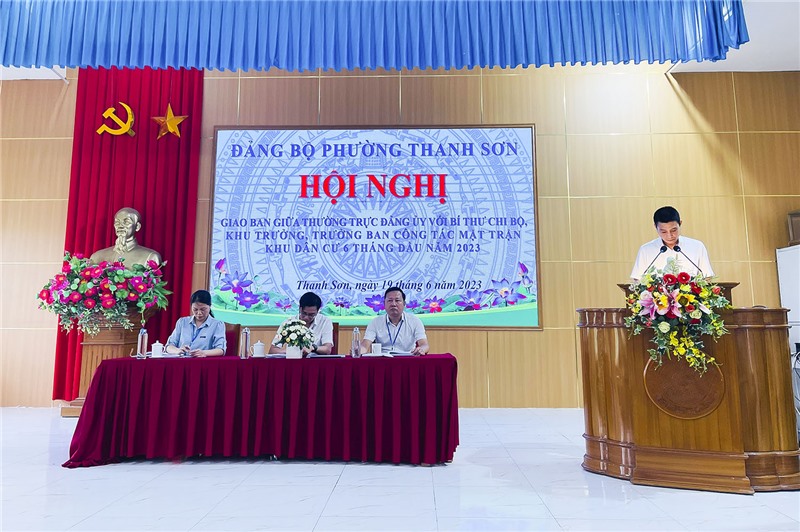 Tại hội nghị, Thường trực Đảng ủy đã thông tin tới các đại biểu kết quả nổi bật trong thực hiện nhiệm vụ công tác 6 tháng đầu năm và một số nhiệm vụ trọng tâm 6 tháng cuối năm. Theo đó, 6 tháng đầu năm, Đảng bộ phường Thanh Sơn lãnh đạo, chỉ đạo thực hiện các các chỉ tiêu, nhiệm vụ đề ra: đã kết nạp Đảng cho 13 quần chúng ưu tú; cử 16 Đảng viên dự bị tham gia lớp bồi dưỡng lý luận chính trị cho đảng viên mới khóa I năm 2023; cử 2 đảng viên tham gia lớp đào tạo Trung cấp lý luận chính trị; vận động xã hội hóa nguồn lực chăm lo cho các đối tượng hộ nghèo, hộ cận nghèo, gia đình khó khăn dịp Tết nguyên đán với kinh phí 136,2 triệu đồng. Thu NSNN trên địa bàn 6 tháng đầu năm ước đạt 8 tỷ 937 triệu đồng, bằng 58,1% kế hoạch UBND thành phố giao, đạt 52,6% kế hoạch HĐND phường giao. Đối với lĩnh vực phát triển kinh tế, đã thành lập mới 17/25 doanh nghiệp (= 68% chỉ tiêu thành phố giao); duy trì sản phẩm đạt chuẩn sản phẩm OCOP của tỉnh và vận động phát triển thêm sản phẩm có giá trị kinh tế cao. Bên cạnh đó, phường tập trung thực hiện các chỉ tiêu, nhiệm vụ chủ đề công tác năm 2023, đặc biệt là các giải pháp về nâng cao chất lượng đời sống nhân dân, chung tay chỉnh trang đô thị. Công tác văn hoá, xã hội có nhiều khởi sắc, đã tổ chức thành công Liên hoan Tiếng hát khu dân cư phườngThanh Sơn năm 2023, tạo không khí sôi nổi, phấn khởi trong cộng đồng dân cư. Công tác quốc phòng quân sự địa phương, tìnhhình an ninh chính trị, trật tự an toàn xã hội đảm bảo, đời sống nhân dân ngày mộtđược nâng cao