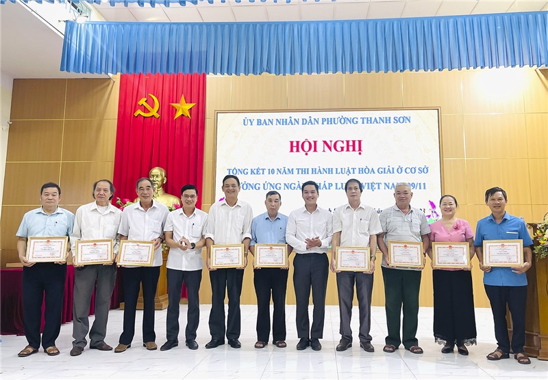 Nhân dịp này, phường Thanh Sơn đã khen thưởng 5 tập thể 10 cá nhân đã có thành tích trong thực hiện thi hành Luật hòa giải ở cơ sở giai đoạn 10 năm 2013 - 2023.