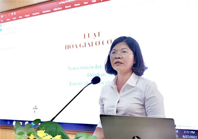 Đồng chí Phạm Thị Thuý - Trưởng phòng Tư pháp thành phố truyền đạt các nội dung về công tác ghi chép sổ hoà giải và biên bản hoà giải.
