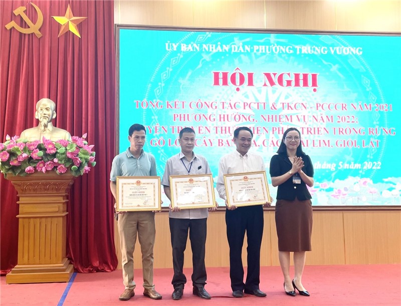 Nhân dịp này, phường Trưng Vương khen thưởng 3 tập thể, 12 cá nhân có thành tích xuất sắc trong công tác PCTT & TKCN, PCCCR năm 2021.