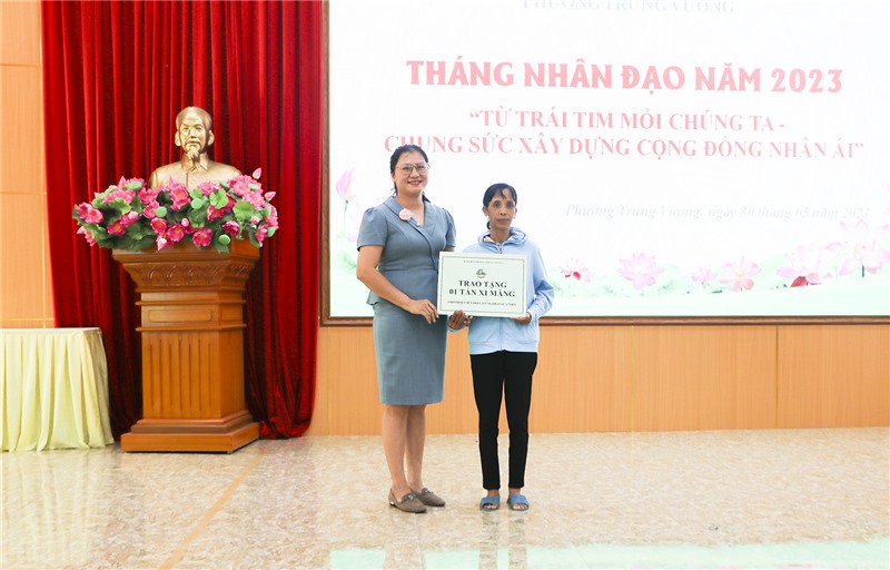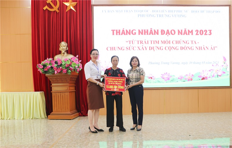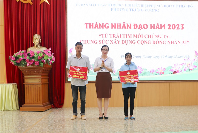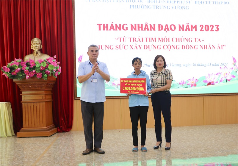 Trong chương trình, phường Trưng Vương đã trao hỗ trợ sửa nhà, hỗ trợ khám chữa bệnh, hỗ trợ mở sổ tiết kiệm và tặng 17 suất quà với tổng trị giá gần 50 triệu đồng.