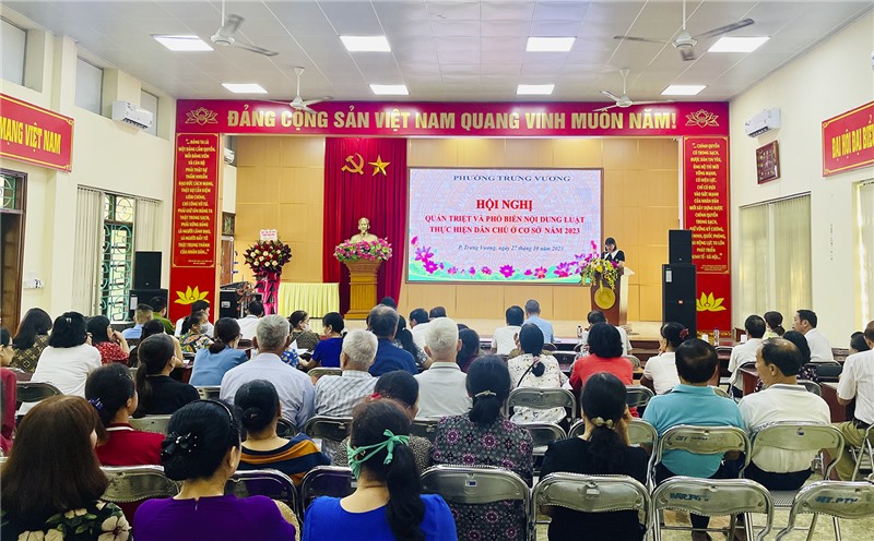 Hưởng ứng Ngày pháp luật nước Cộng hòa xã hội chủ nghĩa Việt Nam 9/11, sáng ngày 27/10, phường Trưng Vương tổ chức Hội nghị quán triệt, phổ biến nội dung Luật Thực hiện dân chủ ở cơ sở năm 2023 cho cán bộ, công chức và Nhân dân trên địa bàn. Đồng chí Nguyễn Lan Anh, Ủy viên BTV Thành ủy, Bí thư Đảng ủy, Chủ tịch HĐND phường dự và trực tiếp truyền đạt nội dung của hội nghị.