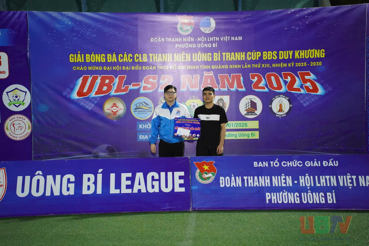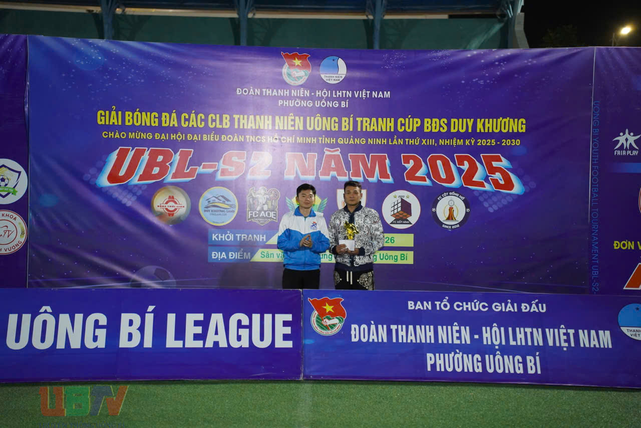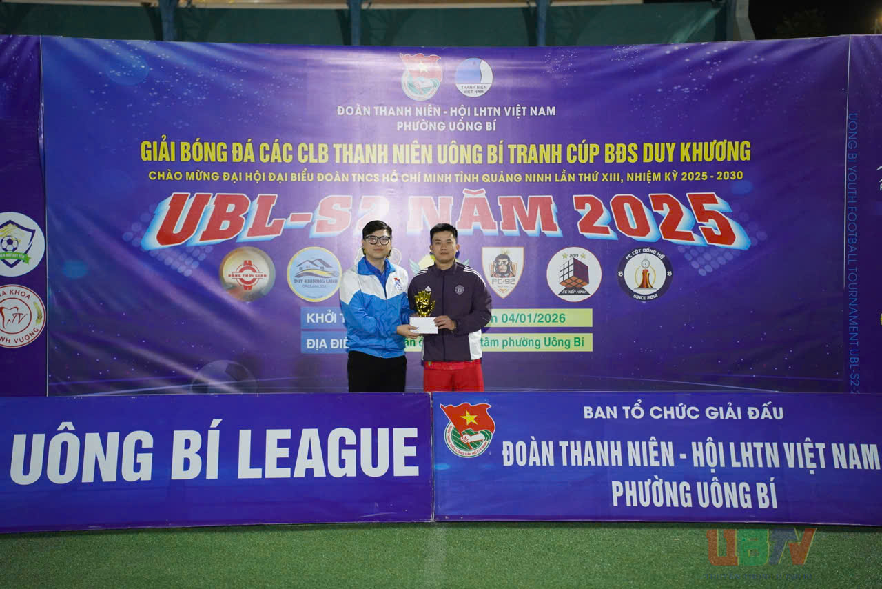 Ban Tổ chức trao Cúp vô địch Giải bóng đá các CLB thanh niên phường Uông Bí UBL-S2 năm 2025 cho đội Cột Đồng Hồ.