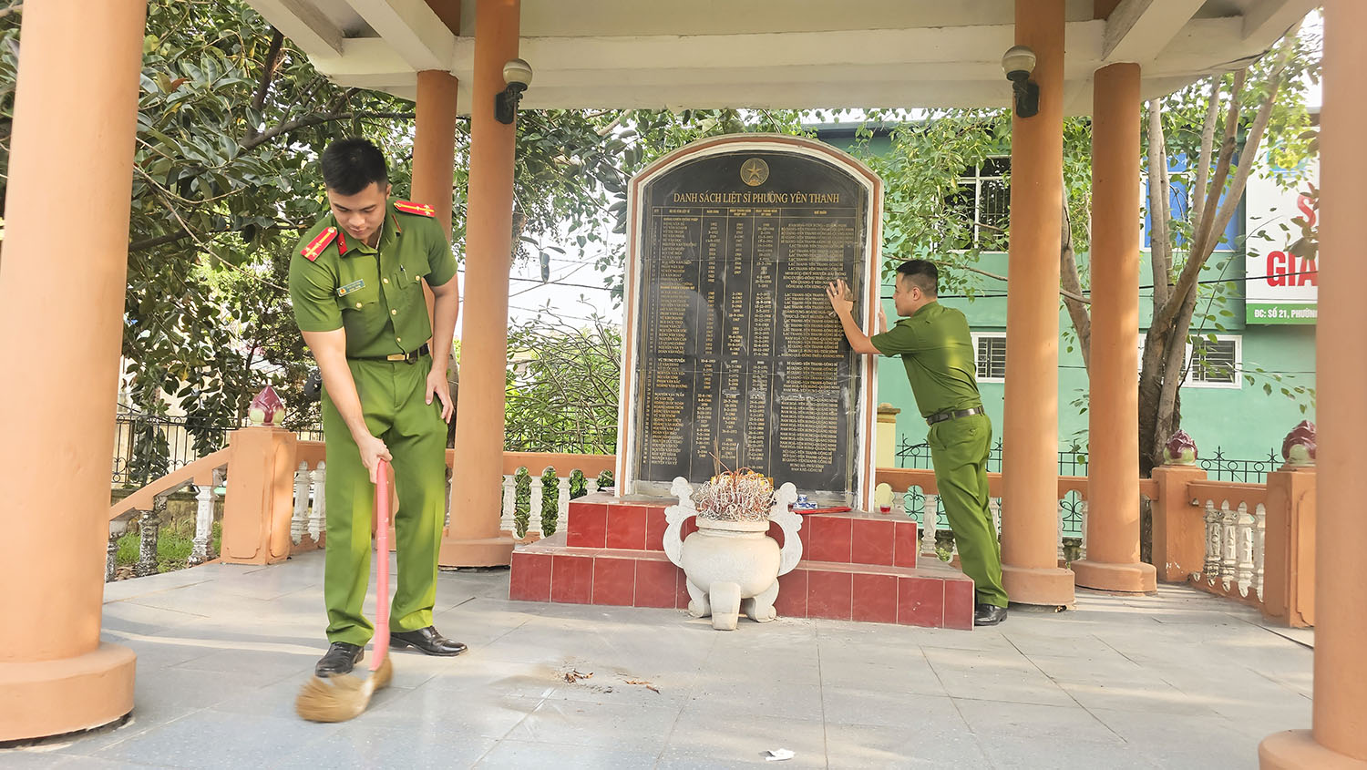 Các cán bộ chiến sĩ Công an phường Uông Bí dọn dẹp cảnh quan nhà Bia liệt sĩ tại khu Bí Giàng.