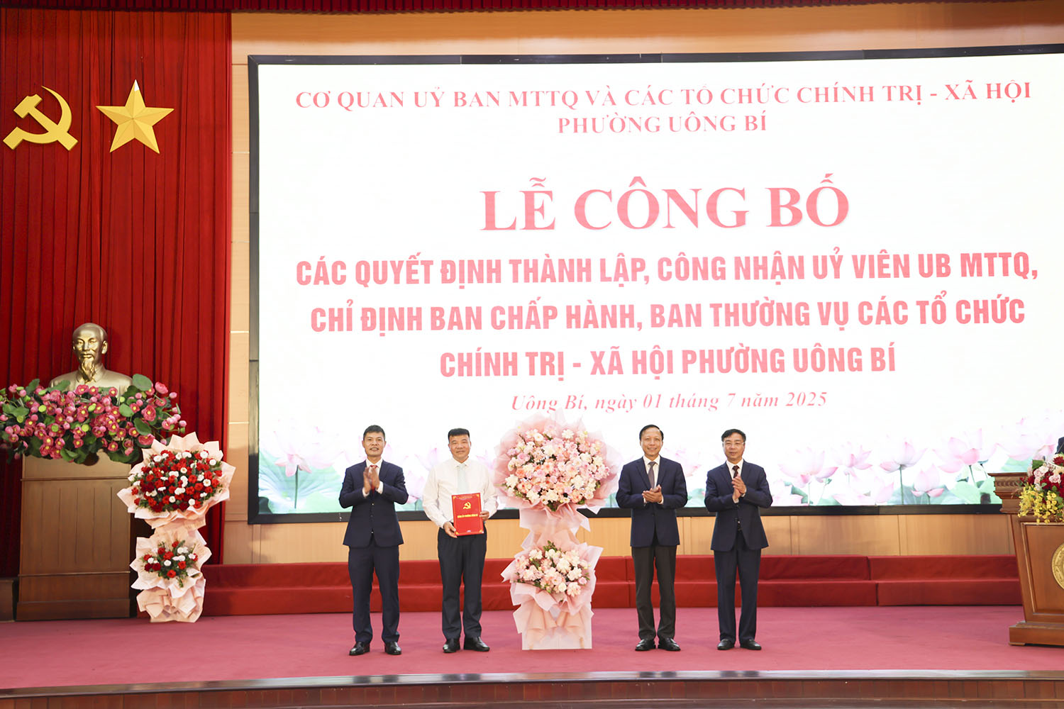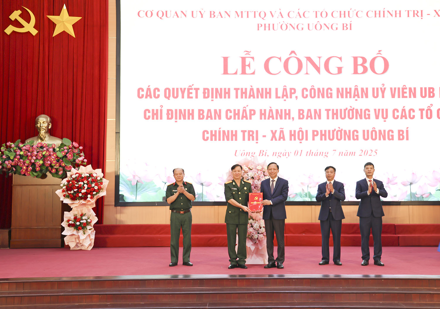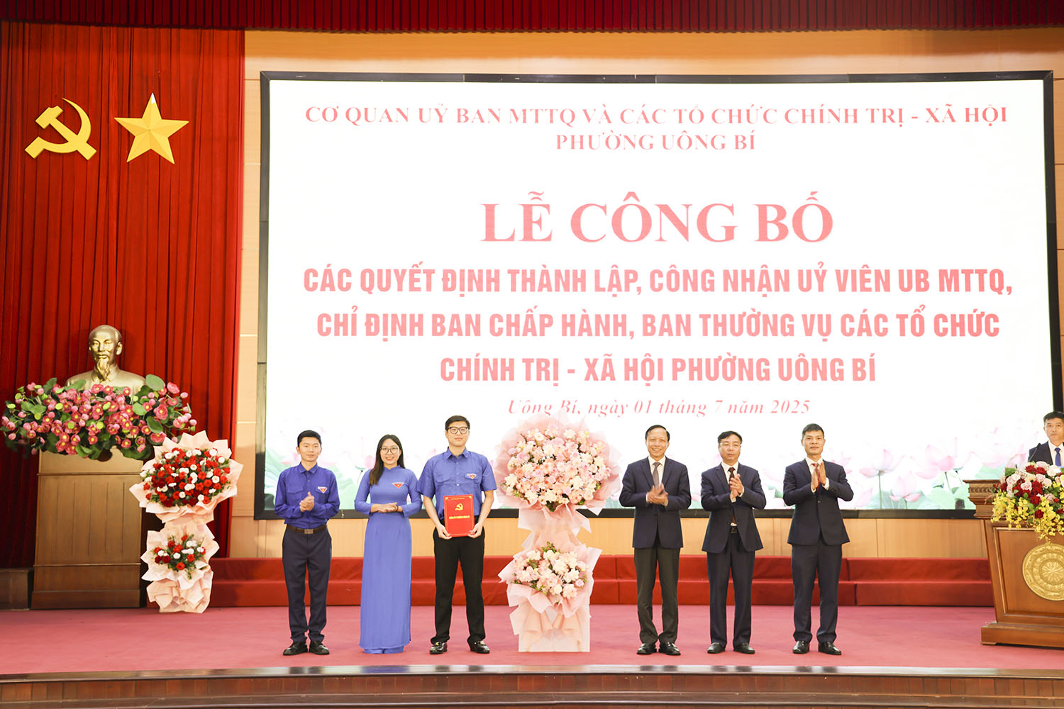 Ngày 01/7, tại Trung tâm tổ chức hội nghị phường Uông Bí đã diễn ra lễ công bố các quyết định thành lập, công nhận Ủy viên Ủy ban MTTQ và chỉ định Ban Chấp hành, Ban Thường vụ các tổ chức chính trị - xã hội của phường. Dự hội nghị có các đồng chí: Nguyễn Chiến Thắng, Bí thư Đảng ủy, Chủ tịch Hội đồng Nhân dân phường; Đào Ngọc Sơn, Phó Bí thư Thường trực Đảng ủy phường.