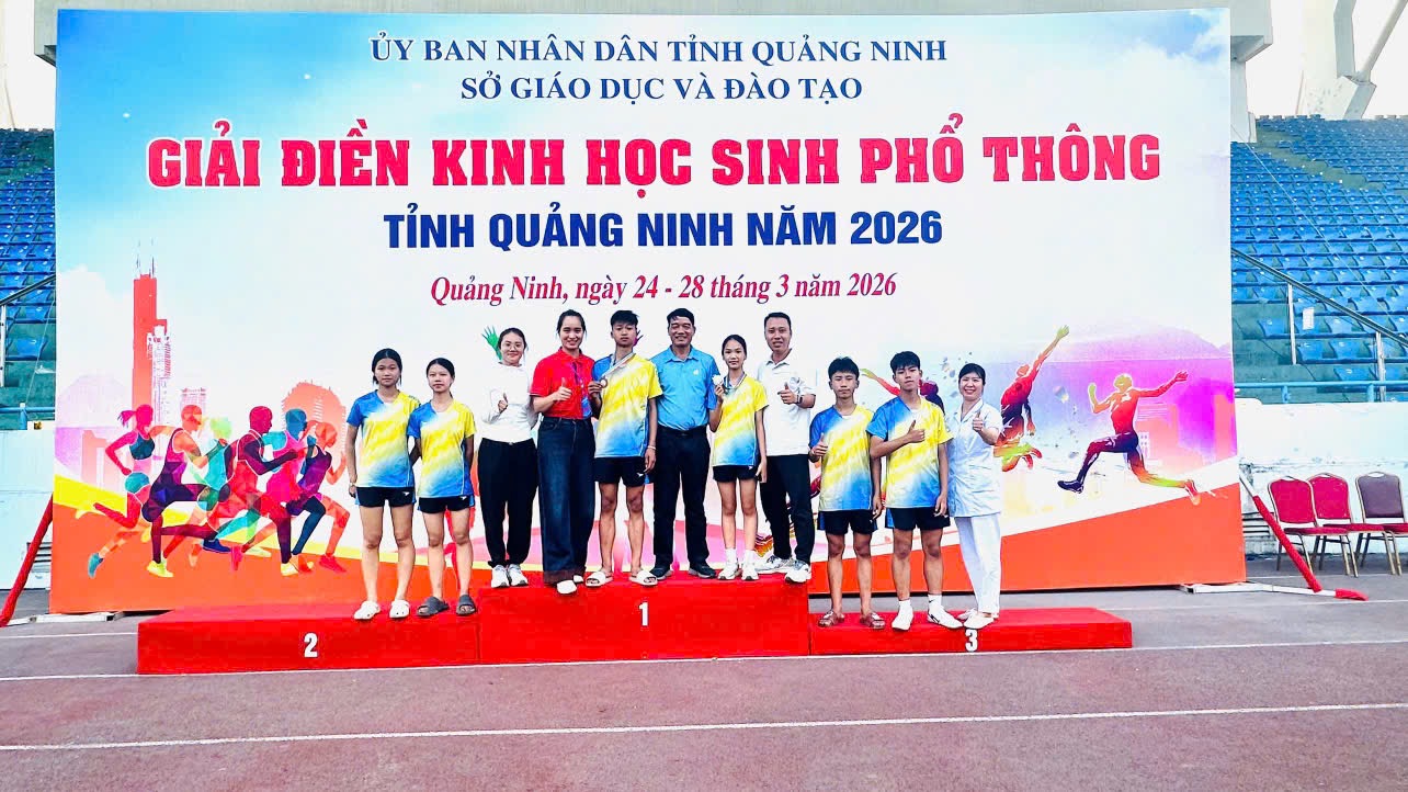 Các vận động viên phường Uông Bí nhận giải tại Giải Điền kinh học sinh phổ thông tỉnh Quảng Ninh năm 2026.