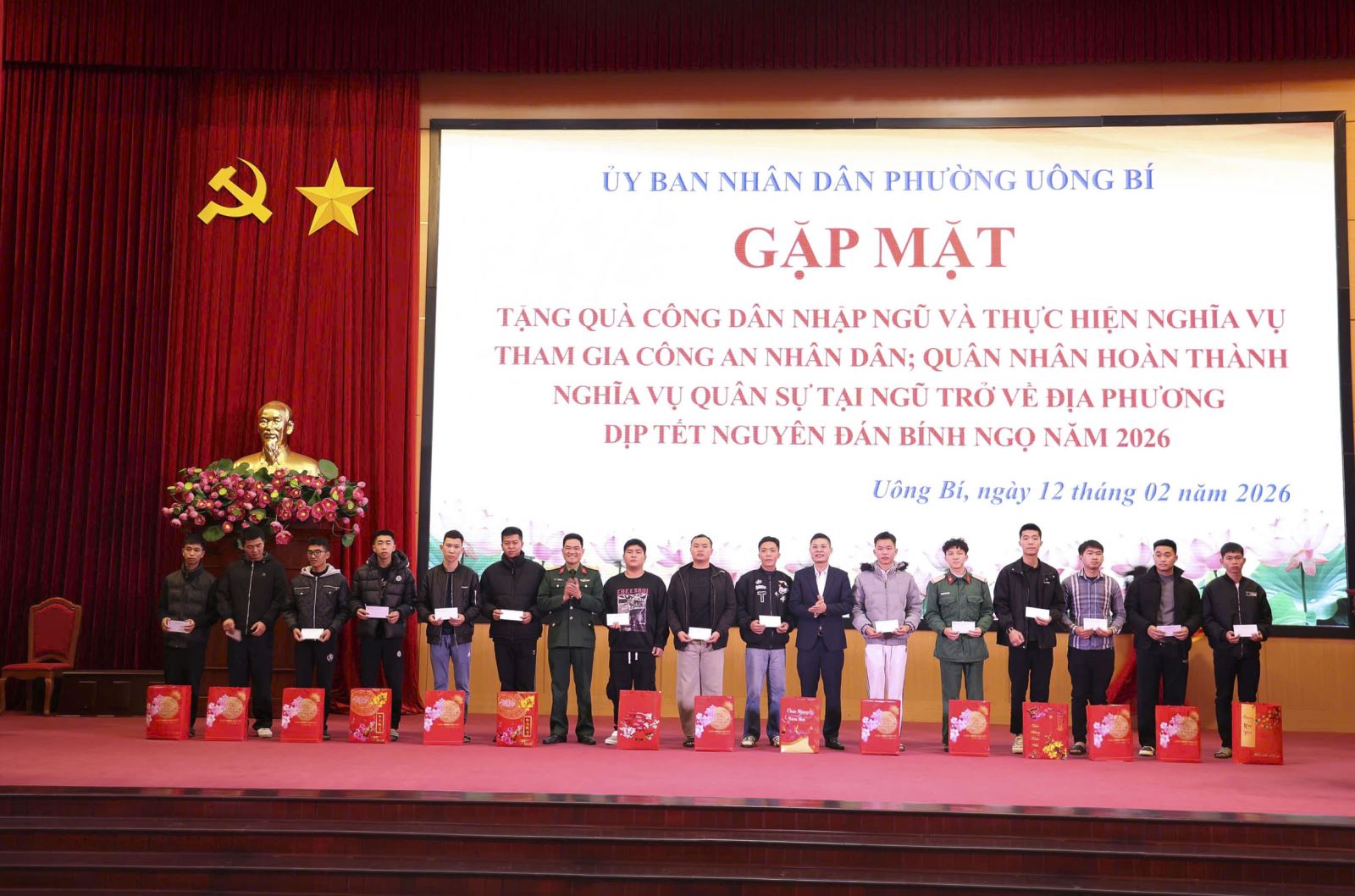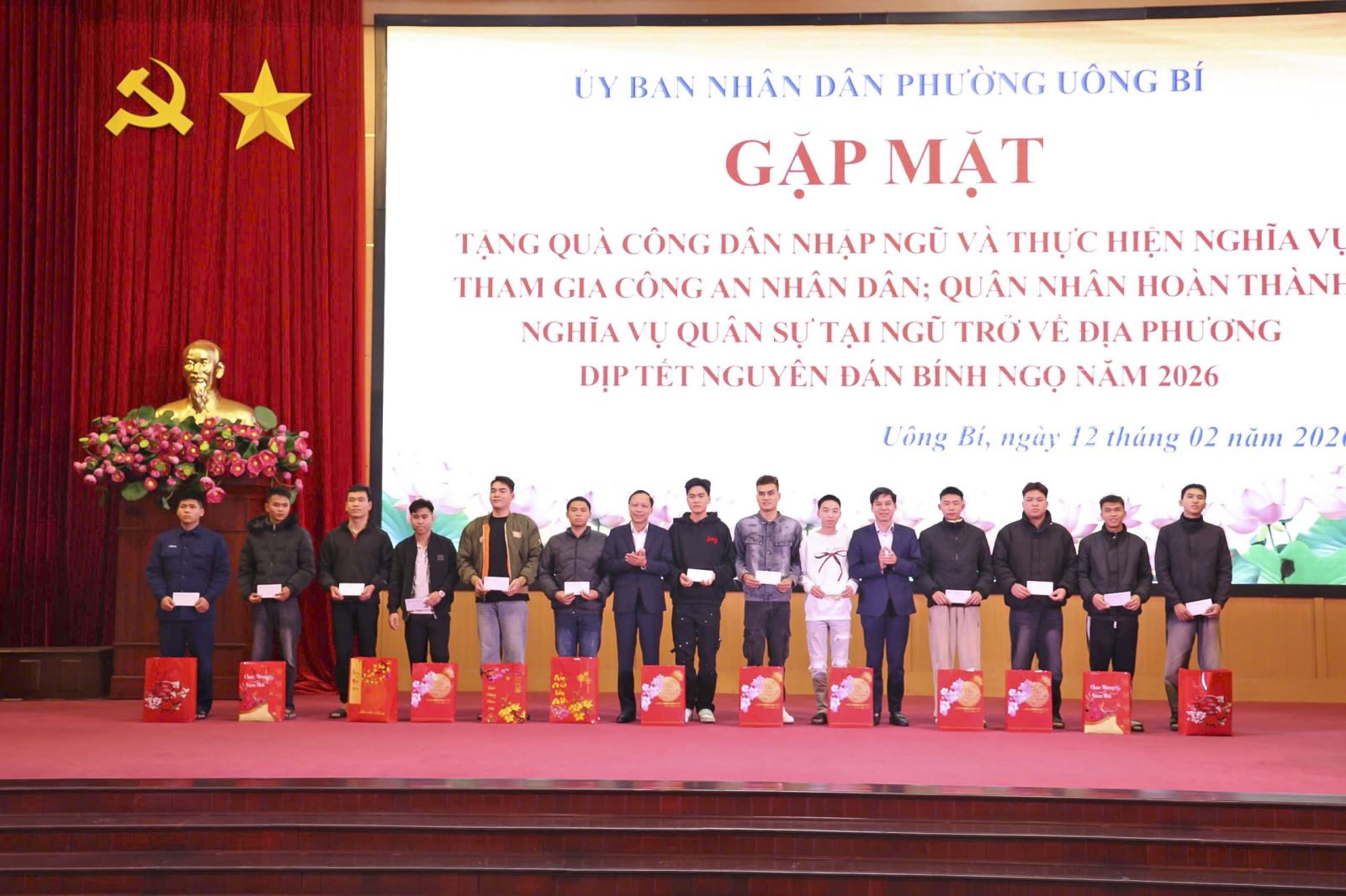 Nhân dịp này, phường Uông Bí đã trao quà động viên 30 quân nhân hoàn thành nghĩa vụ quân sự trở về địa phương và 56 công dân nhập ngũ, tham gia thực hiện nghĩa vụ Công an nhân dân năm 2026. Những phần quà thể hiện sự quan tâm, động viên của cấp ủy, chính quyền và Nhân dân địa phương đối với các thanh niên lên đường làm nhiệm vụ và các quân nhân sau thời gian phục vụ trong quân đội trở về quê hương.