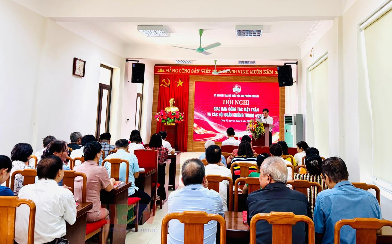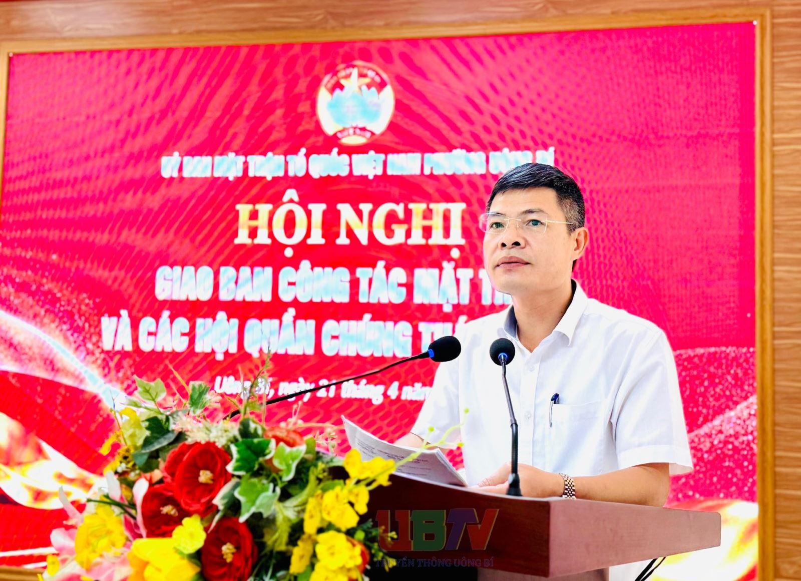 Ngày 21/4/2026, Ủy ban MTTQ Việt Nam phường Uông Bí tổ chức hội nghị giao ban công tác Mặt trận và các hội quần chúng tháng 4/2026. Dự hội nghị có đồng chí Đào Ngọc Sơn, Phó Bí thư Thường trực Đảng ủy phường; đồng chí Nguyễn Hồng Quang, Ủy viên Ban Thường vụ Đảng ủy, Chủ tịch Ủy ban MTTQ phường; đồng chí Vũ Thị Hồng Nhung, Phó Chủ tịch UBND phường; cùng đại diện các tổ chức chính trị - xã hội, các hội quần chúng trên địa bàn.