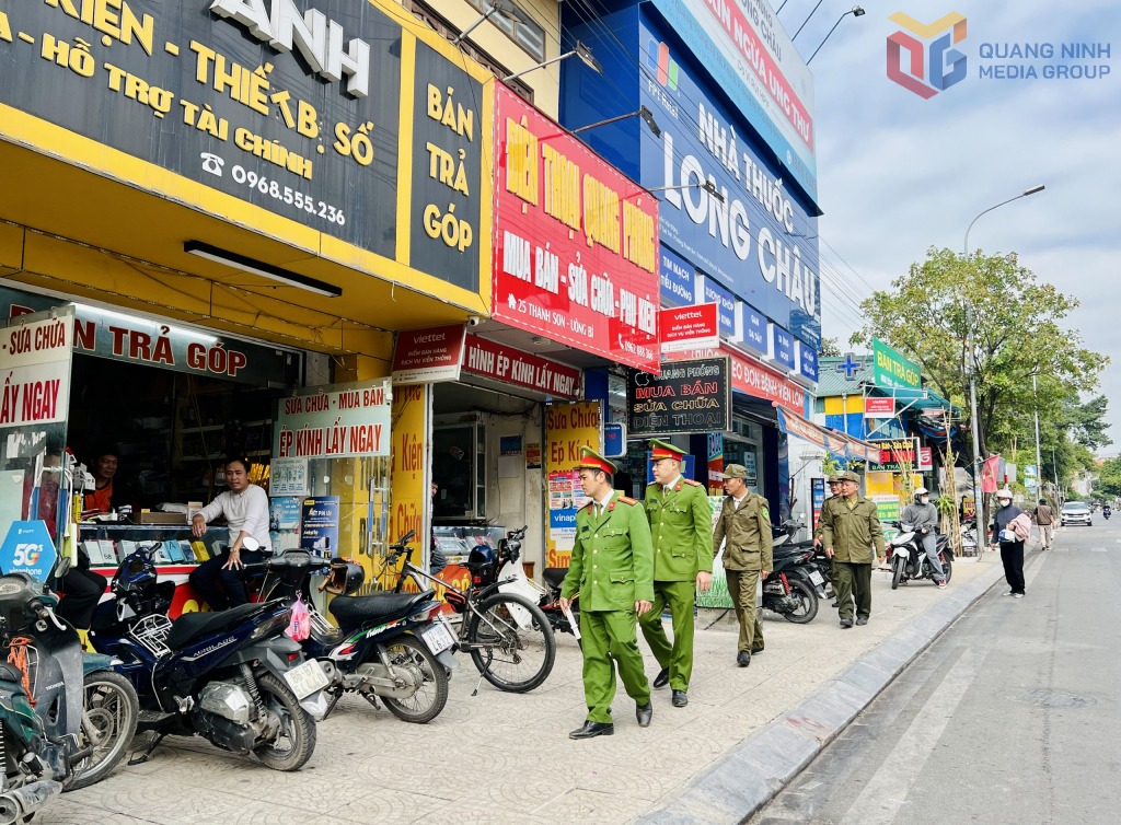 Công an phường Uông Bí đảm bảo trật tự đô thị tại các tuyến đường.