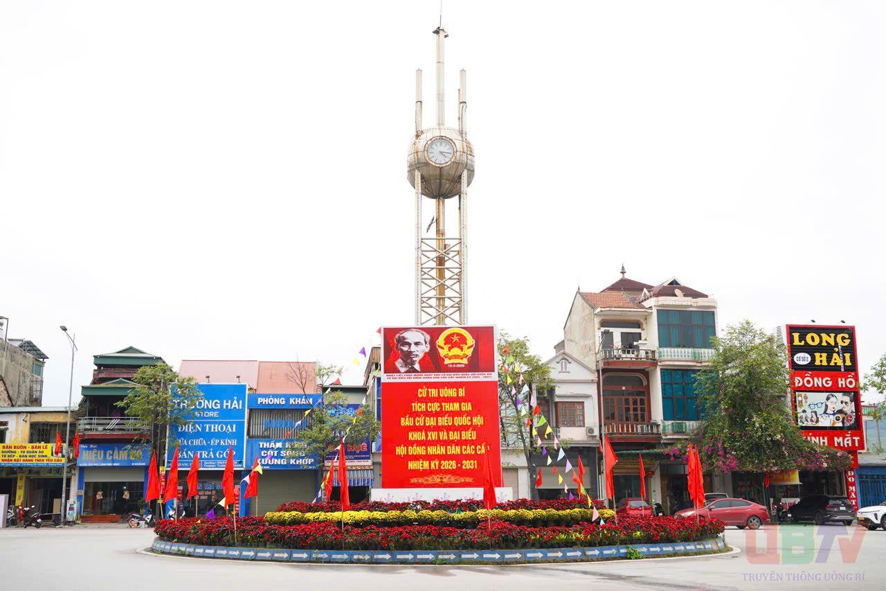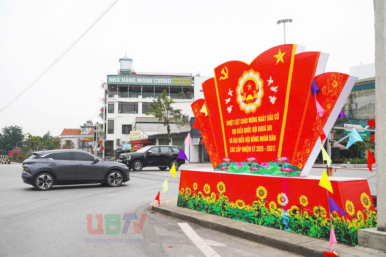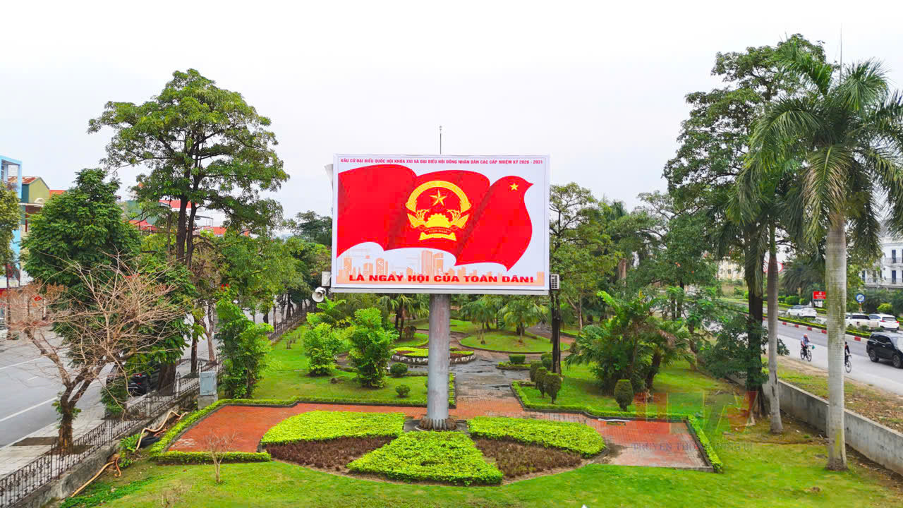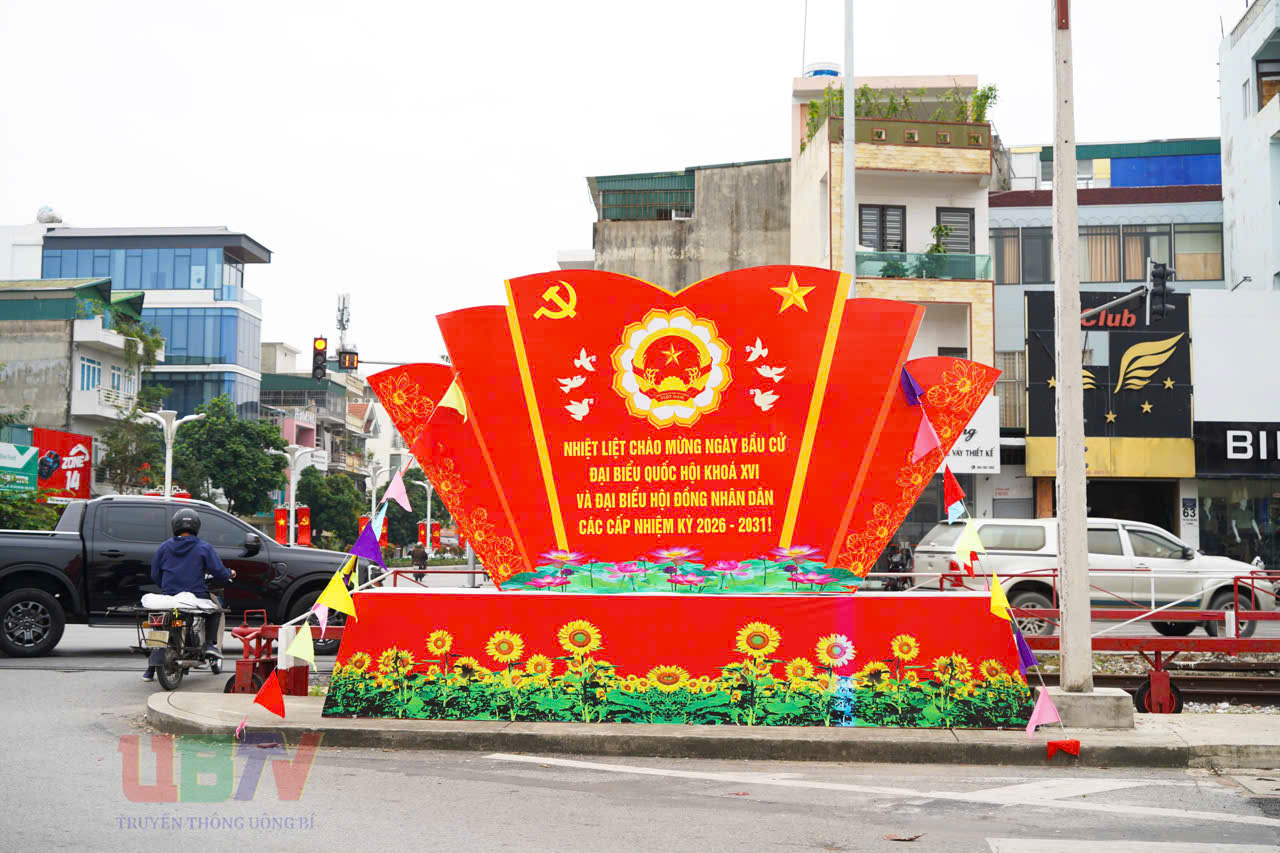Tại các cửa ngõ và nút giao trọng điểm như ngã tư, ngã 7 đường Trần Hưng Đạo, Quảng trường 25-2, các cụm mô hình cổ động được thiết kế công phu, tạo điểm nhấn rực rỡ, truyền tải thông điệp về ngày bầu cử.