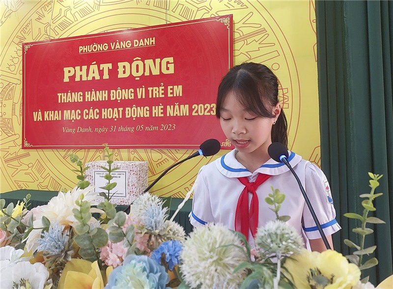 Đại diện cho các em thiếu nhi phường Vàng Danh phát biểu tại buổi lễ phát động.