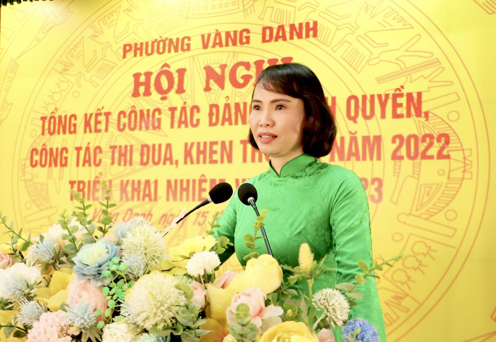 Năm 2022, Đảng bộ, chính quyền và cả hệ thống chính trị phường Vàng Danh đã nỗ lực, đoàn kết, thống nhất, quyết tâm giữ vững ổn định, tiếp nối đà tăng trưởng, hoàn thành thắng lợi các mặt công tác; đạt và vượt mức 19/19 chỉ tiêu chủ yếu đề ra. Đảng ủy đã xây dựng chương trình, kế hoạch triển khai các chỉ thị, nghị quyết, kết luận của Trung ương, của tỉnh và thành phố về phương hướng, nhiệm vụ và chủ đề công tác năm 2022; triển khai đồng bộ chương trình công tác kiểm tra, giám sát của cả hệ thống chính trị. Trong năm, Đảng bộ phường đã kết nạp 12 đảng viên mới, đạt 100% kế hoạch Thành ủy giao. Các mặt công tác chỉ đạo, điều hành của cấp uỷ, chính quyền, hoạt động của MTTQ và các đoàn thể phường có chuyển biến tích cực.