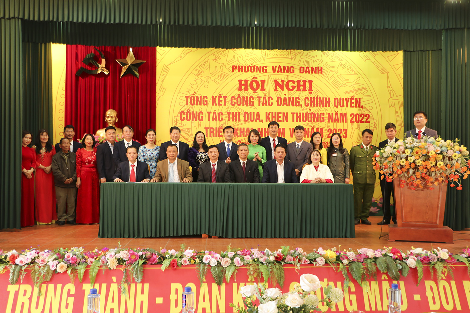 Đại diện các cơ quan, đơn vị, khu dân cư, các ngành của phường Vàng Danh ký kết giao ước thi đua năm 2023.