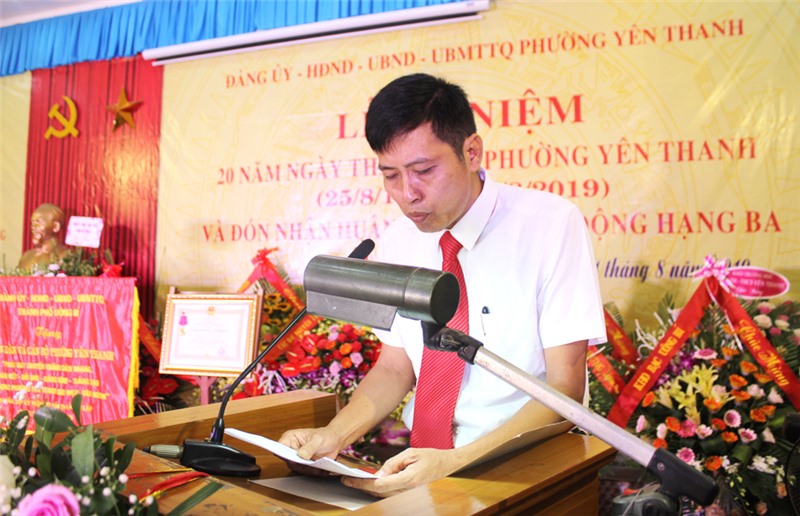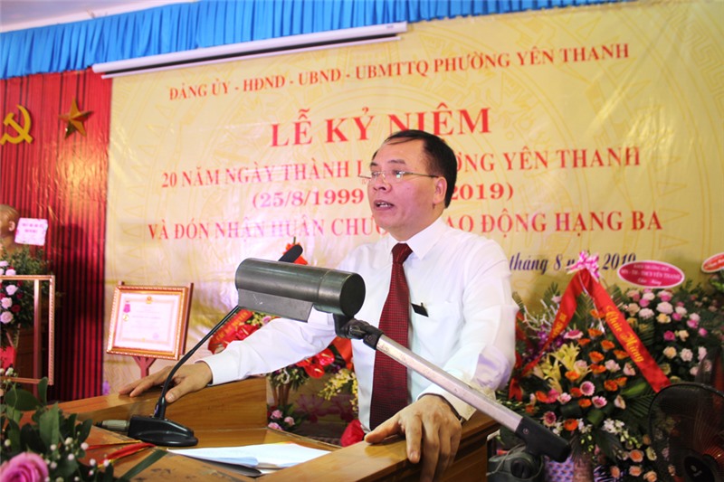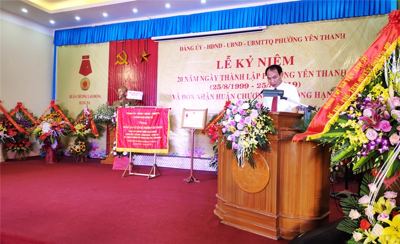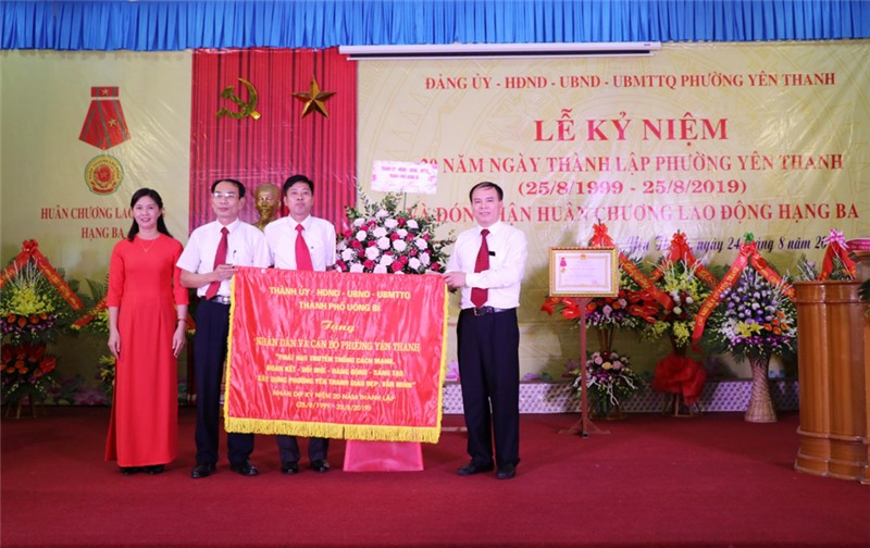 Ngày 24-8, phường Yên Thanh long trọng tổ chức lễ kỷ niệm 20 năm ngày thành lập phường và đón nhận Huân chương Lao Động hạng Ba. Dự chúc mừng buổi lễ có các đồng chí: Trần Văn Lâm, Tỉnh ủy viên, Bí thư Thành ủy, Chủ tịch HĐND thành phố; Phạm Tuấn Đạt, Phó Bí thư Thành ủy, Phó Chủ tịch UBND thành phố; Đặng Đình Sách, UV BTV Thành ủy, Phó Chủ tịch UBND thành phố.