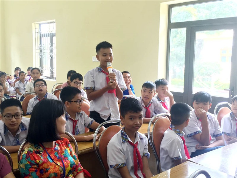 Các em học sinh giao lưu, tìm hiểu kiến thức phòng chống đuối nước.