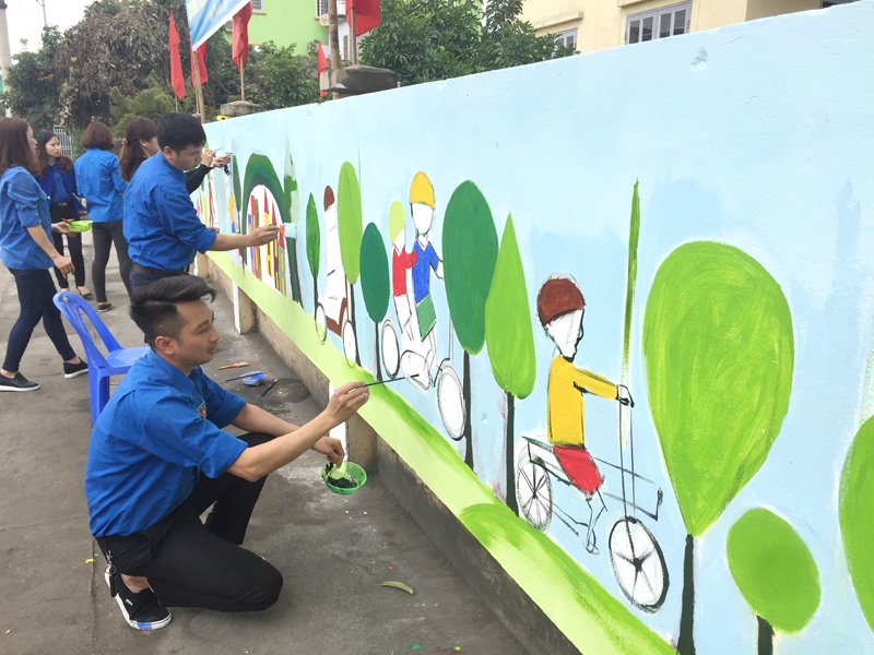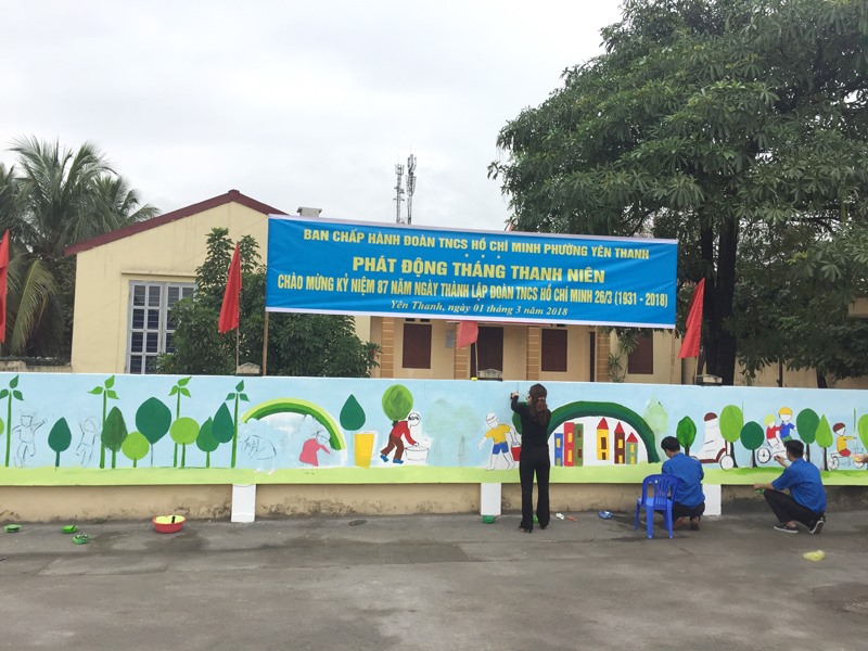 Nhân dịp này, đoàn phường Yên Thanh đã tổ chức vẽ tranh tường với chủ đề bảo vệ môi trường, đảm bảo an toàn giao thông tại Nhà văn hóa khu 1, phường Yên Thanh.
