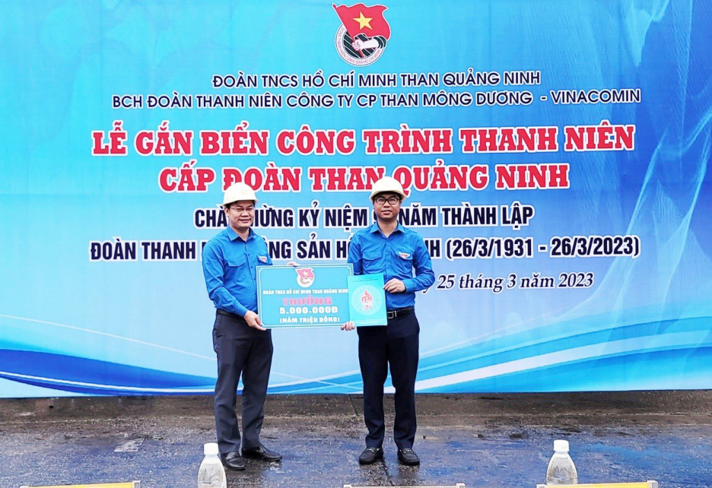 Anh Nguyễn Văn Anh (bên trái) đại diện Đoàn Thanh niên Công ty CP Than Mông Dương - Vinacomin nhận thưởng của Đoàn Than trong thực hiện công trình thanh niên cấp Đoàn Than năm 2023. Ảnh: NVCC