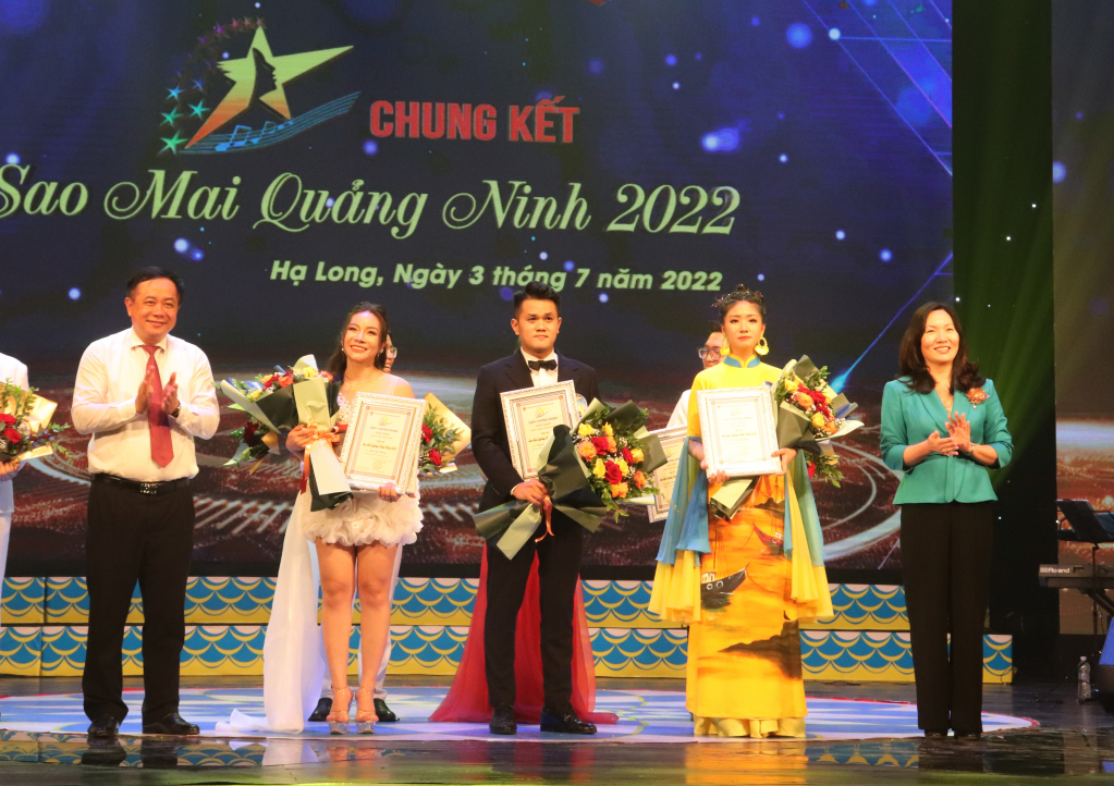 Thí sinh Đoàn Hồng Hạnh (thứ 2, trái sang) và Mai Thu Hương (thứ 4, trái sang) xuất sắc giành giải nhất phong cách nhạc nhẹ và phong cách nhạc dân gian tại cuộc thi Sao Mai Quảng Ninh năm 2022.