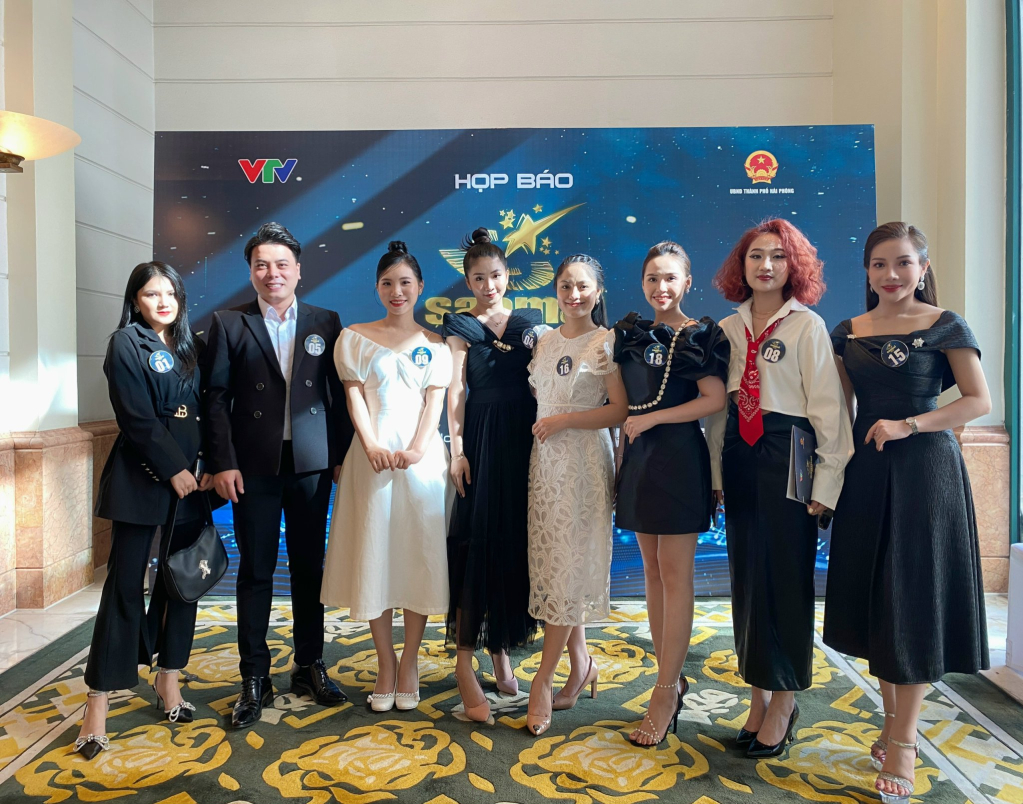 Thí sinh Mai Thu Hương (thứ 4, trái sang) và Đoàn Hồng Hạnh (đầu tiên, bên phải) chụp ảnh cùng các thí sinh của vòng chung kết toàn quốc giải Sao Mai 2022 tại buổi họp báo.