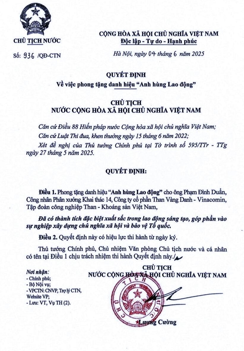 Chủ tịch Nước Lương Cường vừa có Quyết định số 936/ QĐ-CTN ngày 4/6/2025 về việc phong tặng danh hiệu Anh hùng Lao động cho ông Phạm Đình Duẩn hiện là công nhân Phân xưởng Khai thác 14, Công ty CP Than Vàng Danh - Vinacomin, Tập đoàn Công nghiệp Than Khoáng sản Việt Nam, vì đã có thành tích đặc biệt xuất sắc trong lao động sáng tạo, góp phần vào sự nghiệp xây dựng Chủ nghĩa Xã hội và bảo vệ Tổ quốc.