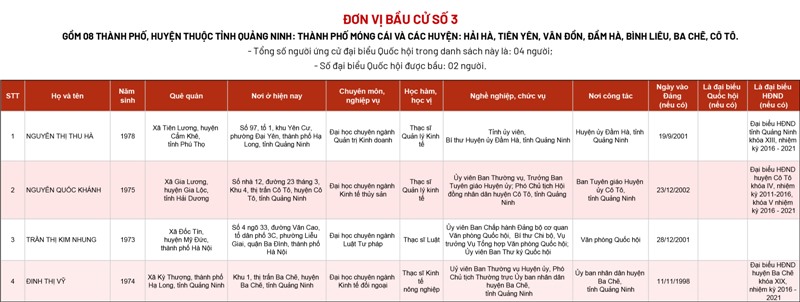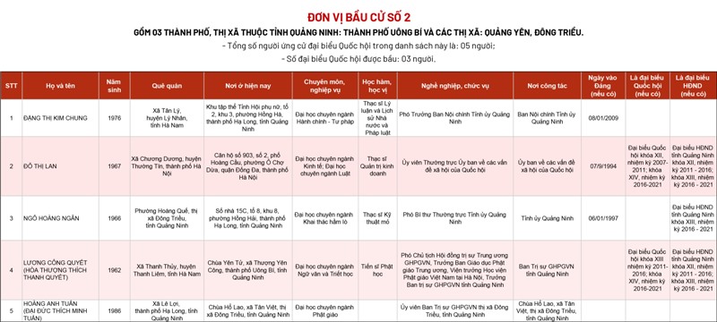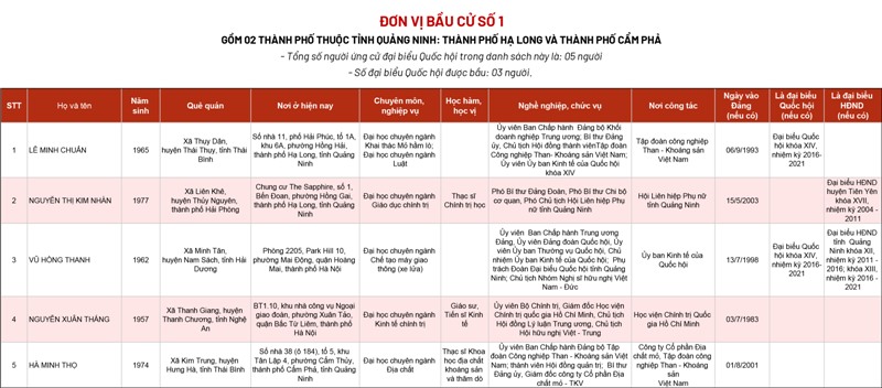 Uỷ ban bầu cử tỉnh Quảng Ninh vừa công bố danh sách chính thức những người ứng cử Đại biểu Quốc hội khoá XV tại các đơn vị bầu cử trên địa bàn tỉnh Quảng Ninh.
