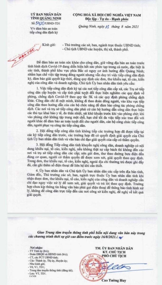 Ngày 13-8, Ủy ban nhân dân tỉnh Quảng Ninh ban hành văn bản số 5420/UBND-TD1 về việc đảm bảo an toàn tiếp công dân định kỳ.