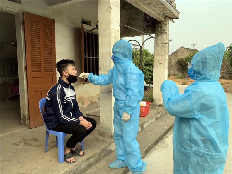 Lực lượng tăng cường Trường Cao đẳng Y tế Quảng Ninh thực hiện lấy mẫu xét nghiệm tại TX Đông Triều.