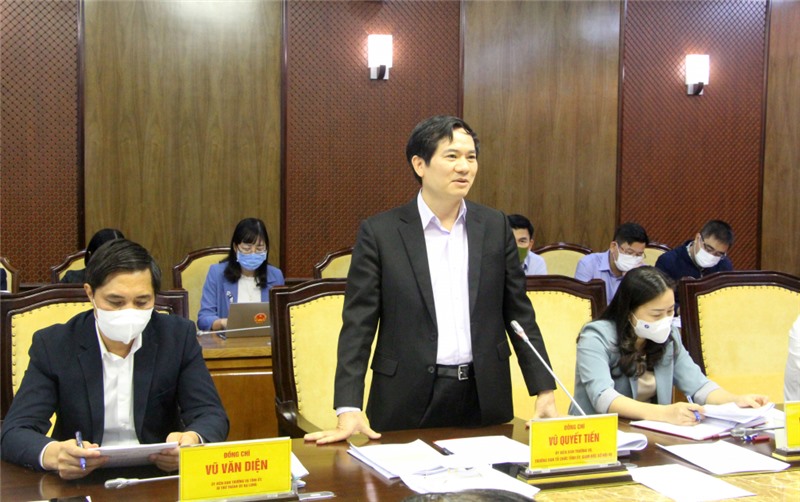 Đồng chí Vũ Quyết Tiến, Trưởng Ban Tổ chức Tỉnh ủy, Giám đốc Sở Nội vụ, phát biểu ý kiến tại hội nghị.