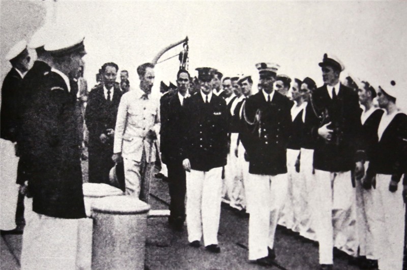 Chủ tịch Hồ Chí Minh trên chiến hạm Emile Bertin ở Vịnh Hạ Long ngày 24/3/1946 theo lời mời của G. d'Argenlieu, Cao uỷ Pháp tại Đông Dương để bàn về thi hành Hiệp định Sơ bộ 6/3/1946. Người đi bên tay trái Bác là Nguyễn Tường Tam, Bộ trưởng Bộ Ngoại giao, đi bên phải Bác là Hoàng Minh Giám, Thứ trưởng Nội vụ nước Việt Nam Dân chủ Cộng hoà. Ảnh: Tư liệu