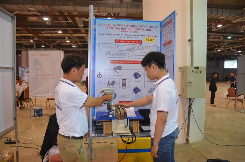 Giáo viên hướng dẫn thí sinh (bên phải) đến từ tỉnh Ninh Thuận tham gia Cuộc thi KHKT cấp quốc gia học sinh trung học năm học 2022-2023, lĩnh vực Kỹ thuật Y Sinh.