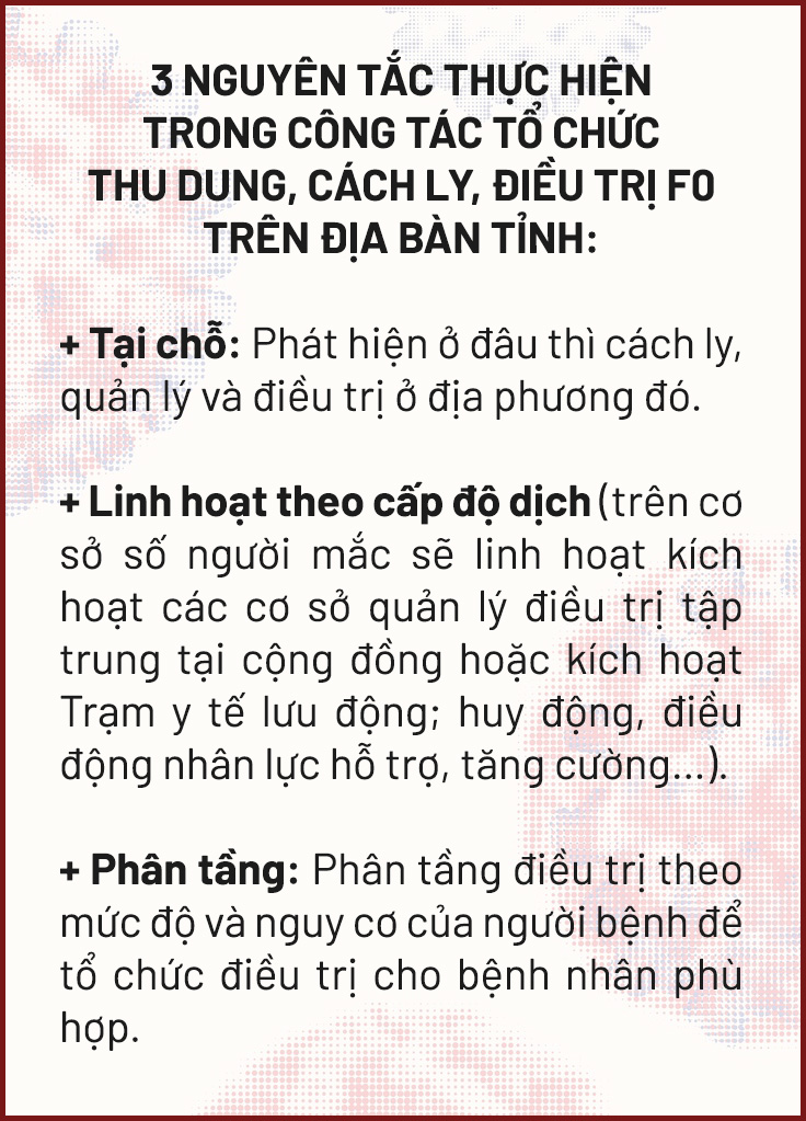 Trước số F0 tăng đột biến và những thực trạng trên, các cấp, các ngành của tỉnh đã và đang có sự điều chỉnh trong công tác phòng, chống dịch, nhất là tăng cường đồng hành cùng với F0 trong việc chữa trị tại nhà. Theo chỉ đạo của tỉnh, các huyện, thị xã, thành phố đã thành lập 137 trạm y tế lưu động; trong đó kích hoạt trên 100 trạm, thu hút trên 12.000 nhân viên y tế, tình nguyện viên tham gia hỗ trợ tư vấn sức khỏe cho F0 điều trị tại nhà. Cùng với đó, 177 trạm y tế cố định đưa vào sử dụng phần mềm quản lý thông tin, tư vấn sức khỏe F0 điều trị tại nhà và được bố trí tăng cường nhân lực để 100% trạm có bác sĩ công tác, đáp ứng yêu cầu chuyên môn y tế cho các tuyến y tế cơ sở. Các TYTT tuyến huyện, tuyến tỉnh cũng điều động thêm nhân lực hỗ trợ cho tuyến y tế cơ sở trong điều trị F0 tại nhà.