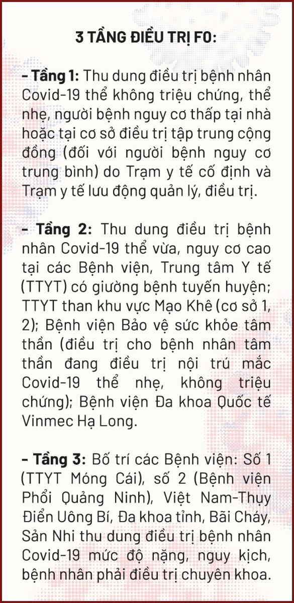 Theo chỉ đạo của Chính phủ, Bộ Y tế, ngay từ giữa năm 2021, tỉnh Quảng Ninh đã có những điều chỉnh trong công tác thu dung, quản lý, điều trị F0 trên địa bàn. Một trong những bước chuyển mạnh với tính linh hoạt cao đó là tỉnh mạnh dạn đi đầu trong phân tầng cách ly F1 tại nhà; triển khai sớm điều trị F0 tại nhà và đưa thuốc kháng virus vào điều trị F0 tại nhà… Với cách làm quyết liệt, Quảng Ninh đã có những kinh nghiệm, bài học quý để định hướng, thay đổi các biện pháp chống dịch phù hợp với tình hình mới. Mặc dù số ca mắc Covid-19 hiện vẫn cao, tuy nhiên tỉnh luôn vững vàng thực hiện hiệu quả công tác cách ly, điều trị F0, góp phần giảm tình trạng chuyển nặng, tử vong.