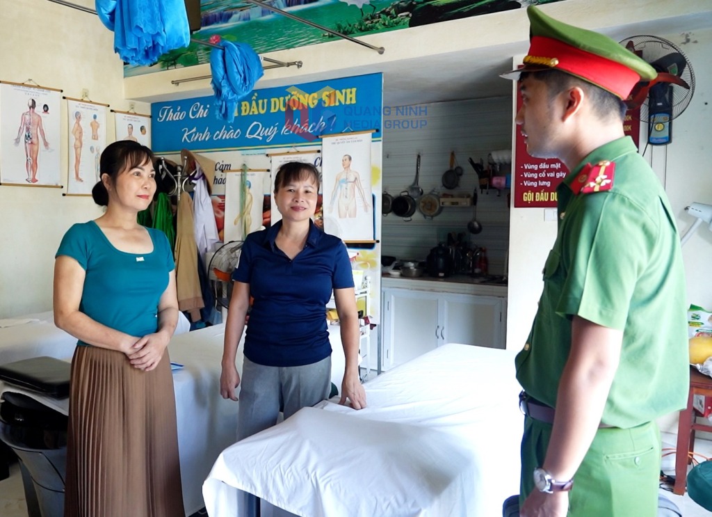 Công an phường Hạ Long tuyên truyền công tác phòng chống cháy nổ cho các hộ kinh doanh tại khu phố 6, phường Hạ Long. Ảnh: Hồng Việt